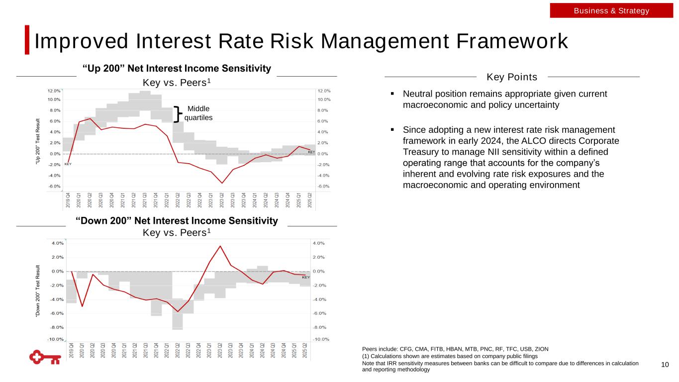 Sticky, Granular Deposit Base 9 (1) Other includes treasury brokered deposits and other deposits; (2) Cumulative beta indexed to 3Q24 through 2Q25; (3) Represents period-end consolidated total loans and loans held for sale divided by period-end consolidated total deposits as of 6/30/25 Average Deposit Balances Deposit Franchise Highlights Total Cost of Deposits Trend $ in billions 2.28% 2.39% 2.18% 2.06% 1.99% 2.85% 2.96% 2.71% 2.53% 2.44% 5.50% 5.00% 4.50% 4.50% 4.50% 1.80% 2.80% 3.80% 4.80% 5.80% 1.10% 2.10% 3.10% 4.10% 5.10% 2Q24 3Q24 4Q24 1Q25 2Q25 Business & Strategy $79.5 $88.5 $90.1 $82.8 $85.9 $88.2 $47.1 $55.6 $54.7 $55.0 $58.0 $56.7 $127.3 $145.0 $146.9 $144.1 $146.2 $148.0 2020 2021 2022 2023 2024 1H25 ▪ Client deposits up 2% year-over-year in 1H25 despite meaningful reduction in rates paid ▪ NIB deposits: 23% of total deposits including hybrid accounts ▪ Commercial deposit balances driven by relationship clients - 79% of commercial deposits in core operating accounts - 95% of all commercial deposits have an operating account ▪ Cumulative down interest-bearing deposit beta: ~55%(2) - Overall (interest-bearing) funding cumulative beta: ~69%(2) ▪ Loan-to-deposit ratio: 73%(3) Proactive deposit beta management supported by relationship-based deposits Total deposit cost Fed Funds rate +3% CAGR Period end deposits increased 2% YoY Consumer Other(1) Commercial Interest-bearing deposit cost