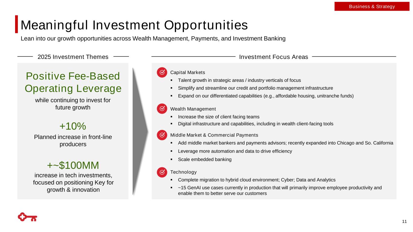 “Down 200” Net Interest Income Sensitivity Key vs. Peers1 Improved Interest Rate Risk Management Framework Middle quartiles ▪ Neutral position remains appropriate given current macroeconomic and policy uncertainty ▪ Since adopting a new interest rate risk management framework in early 2024, the ALCO directs Corporate Treasury to manage NII sensitivity within a defined operating range that accounts for the company’s inherent and evolving rate risk exposures and the macroeconomic and operating environment Key Points “Up 200” Net Interest Income Sensitivity Key vs. Peers1 Peers include: CFG, CMA, FITB, HBAN, MTB, PNC, RF, TFC, USB, ZION (1) Calculations shown are estimates based on company public filings Note that IRR sensitivity measures between banks can be difficult to compare due to differences in calculation and reporting methodology “U p 2 0 0 ” T e s t R e s u lt “D o w n 2 0 0 ” T e s t R e s u lt 10 Business & Strategy