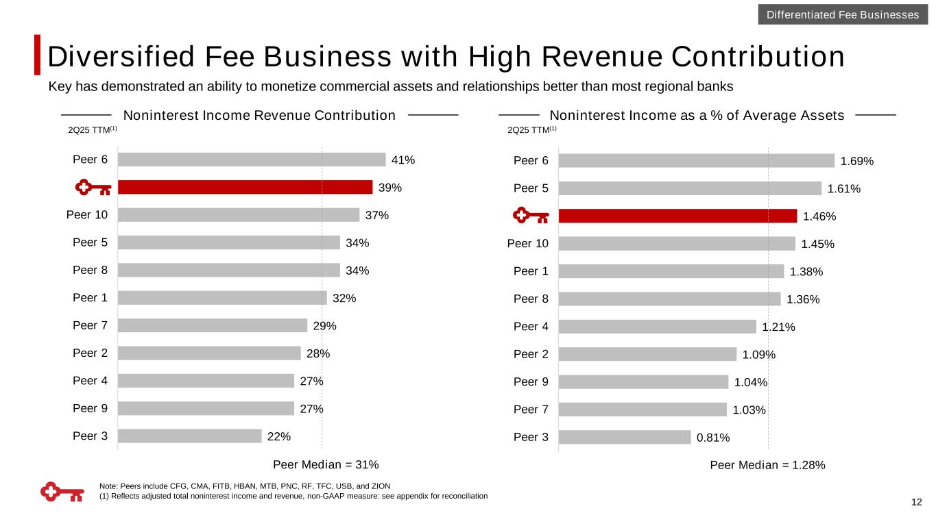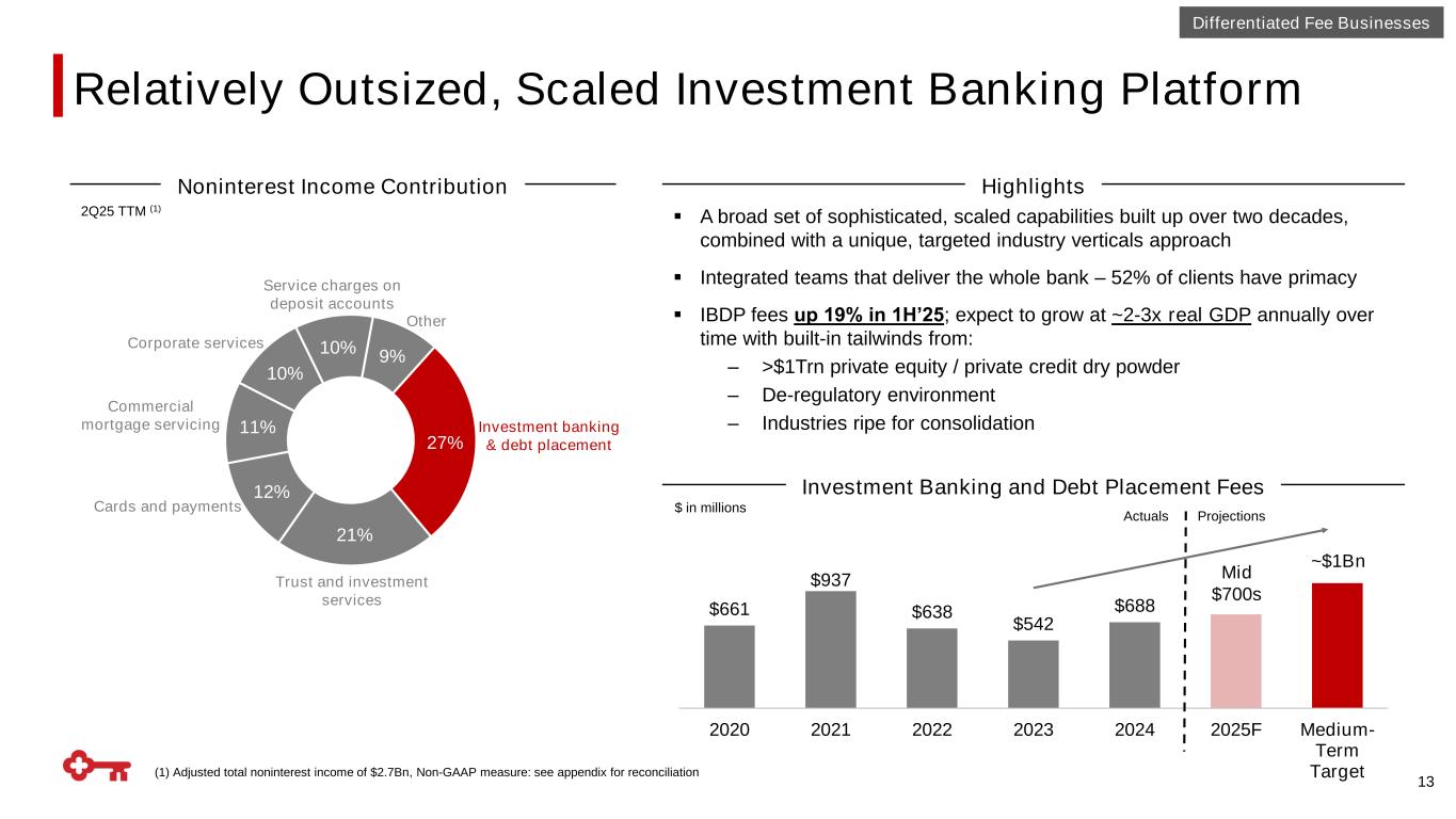 Diversified Fee Business with High Revenue Contribution 12 Noninterest Income as a % of Average Assets 0.81% 1.03% 1.04% 1.09% 1.21% 1.36% 1.38% 1.45% 1.46% 1.61% 1.69% Peer 3 Peer 7 Peer 9 Peer 2 Peer 4 Peer 8 Peer 1 Peer 10 Peer 5 Peer 6 Peer Median = 1.28% Differentiated Fee Businesses 22% 27% 27% 28% 29% 32% 34% 34% 37% 39% 41% Peer 3 Peer 9 Peer 4 Peer 2 Peer 7 Peer 1 Peer 8 Peer 5 Peer 10 Peer 6 Peer Median = 31% Noninterest Income Revenue Contribution 2Q25 TTM(1) Note: Peers include CFG, CMA, FITB, HBAN, MTB, PNC, RF, TFC, USB, and ZION (1) Reflects adjusted total noninterest income and revenue, non-GAAP measure: see appendix for reconciliation 2Q25 TTM(1) Key has demonstrated an ability to monetize commercial assets and relationships better than most regional banks