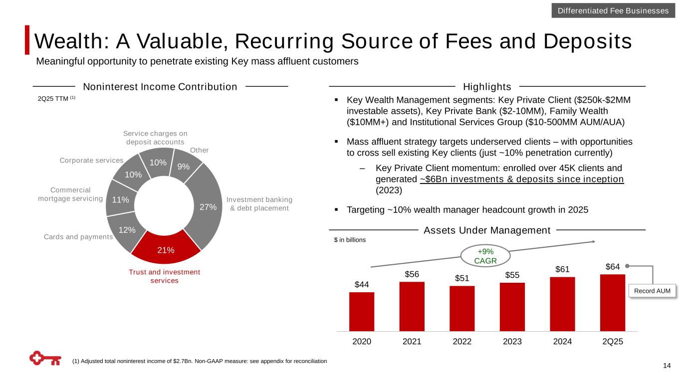 Differentiated Fee Businesses Relatively Outsized, Scaled Investment Banking Platform 13 27% 21% 12% 11% 10% 10% 9% Noninterest Income Contribution Investment banking & debt placement 2Q25 TTM (1) Trust and investment services Cards and payments Service charges on deposit accounts Corporate services Commercial mortgage servicing Other Highlights Investment Banking and Debt Placement Fees $661 $937 $638 $542 $688 2020 2021 2022 2023 2024 2025F Medium- Term Target ▪ A broad set of sophisticated, scaled capabilities built up over two decades, combined with a unique, targeted industry verticals approach ▪ Integrated teams that deliver the whole bank – 52% of clients have primacy ▪ IBDP fees up 19% in 1H’25; expect to grow at ~2-3x real GDP annually over time with built-in tailwinds from: ‒ >$1Trn private equity / private credit dry powder ‒ De-regulatory environment ‒ Industries ripe for consolidation $ in millions Mid $700s ~$1Bn (1) Adjusted total noninterest income of $2.7Bn, Non-GAAP measure: see appendix for reconciliation ProjectionsActuals