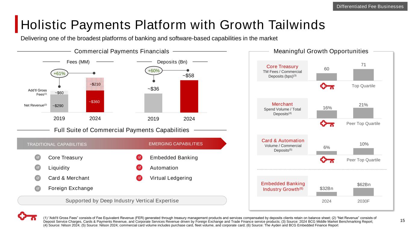 Wealth: A Valuable, Recurring Source of Fees and Deposits 14 2Q25 TTM (1) Highlights Assets Under Management $44 $56 $51 $55 $61 $64 2020 2021 2022 2023 2024 2Q25 +9% CAGR ▪ Key Wealth Management segments: Key Private Client ($250k-$2MM investable assets), Key Private Bank ($2-10MM), Family Wealth ($10MM+) and Institutional Services Group ($10-500MM AUM/AUA) ▪ Mass affluent strategy targets underserved clients – with opportunities to cross sell existing Key clients (just ~10% penetration currently) ‒ Key Private Client momentum: enrolled over 45K clients and generated ~$6Bn investments & deposits since inception (2023) ▪ Targeting ~10% wealth manager headcount growth in 2025 $ in billions Record AUM Noninterest Income Contribution (1) Adjusted total noninterest income of $2.7Bn. Non-GAAP measure: see appendix for reconciliation 27% 21% 12% 11% 10% 10% 9% Investment banking & debt placement Trust and investment services Cards and payments Service charges on deposit accounts Corporate services Commercial mortgage servicing Other Meaningful opportunity to penetrate existing Key mass affluent customers Differentiated Fee Businesses