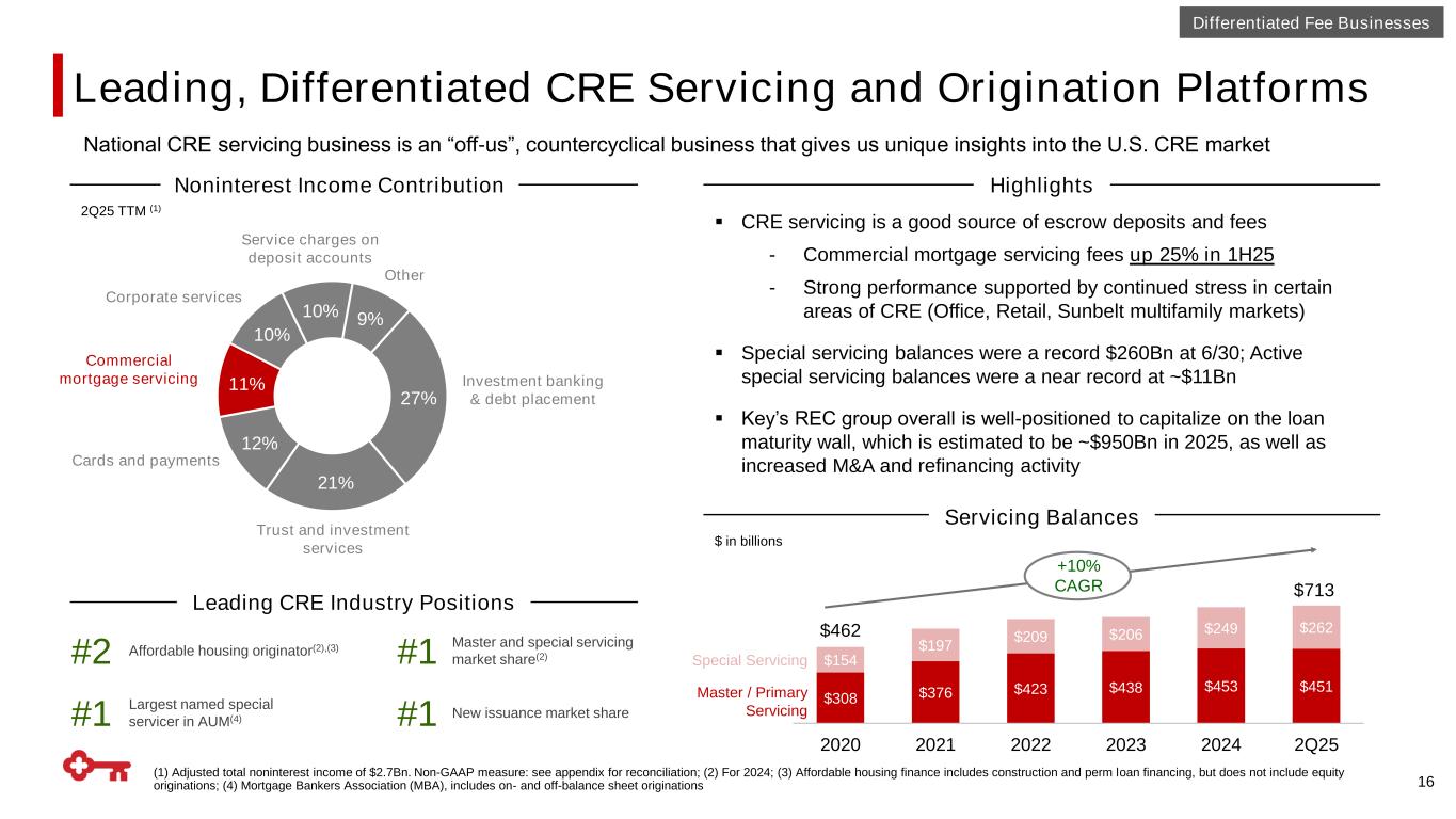 Full Suite of Commercial Payments Capabilities TRADITIONAL CAPABILITIES EMERGING CAPABILITIES Core Treasury Liquidity Card & Merchant Foreign Exchange Embedded Banking Automation Virtual Ledgering Supported by Deep Industry Vertical Expertise Holistic Payments Platform with Growth Tailwinds 15 (1) “Add’tl Gross Fees” consists of Fee Equivalent Revenue (FER) generated through treasury management products and services compensated by deposits clients retain on balance sheet; (2) “Net Revenue” consists of Deposit Service Charges, Cards & Payments Revenue, and Corporate Services Revenue driven by Foreign Exchange and Trade Finance service products; (3) Source: 2024 BCG Middle Market Benchmarking Report; (4) Source: Nilson 2024; (5) Source: Nilson 2024; commercial card volume includes purchase card, fleet volume, and corporate card; (6) Source: The Ayden and BCG Embedded Finance Report Delivering one of the broadest platforms of banking and software-based capabilities in the market Commercial Payments Financials Meaningful Growth Opportunities Core Treasury TM Fees / Commercial Deposits (bps)(3) 60 71 Key Top Quartile Merchant Spend Volume / Total Deposits(4) 16% 21% Key Peer Top Quartile Card & Automation Volume / Commercial Deposits(5) 6% 10% Key Peer Top Quartile Embedded Banking Industry Growth(6) $32Bn $62Bn 2024 2030F ~$36 ~$58 2019 2024 Fees (MM) Deposits (Bn) +60% ~$290 ~$360 ~$60 ~$210 2019 2024 +61% Net Revenue(2) Add’tl Gross Fees(1) Differentiated Fee Businesses