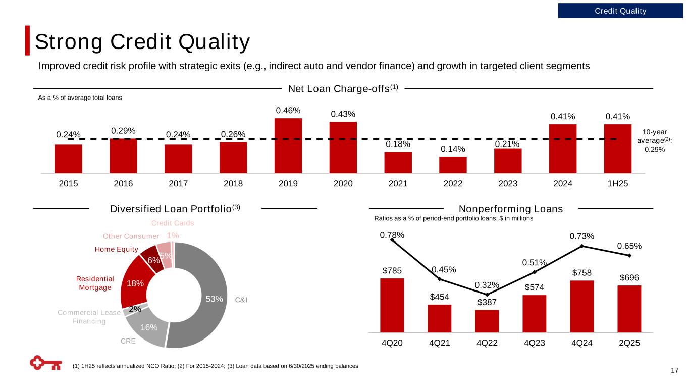 ▪ CRE servicing is a good source of escrow deposits and fees - Commercial mortgage servicing fees up 25% in 1H25 - Strong performance supported by continued stress in certain areas of CRE (Office, Retail, Sunbelt multifamily markets) ▪ Special servicing balances were a record $260Bn at 6/30; Active special servicing balances were a near record at ~$11Bn ▪ Key’s REC group overall is well-positioned to capitalize on the loan maturity wall, which is estimated to be ~$950Bn in 2025, as well as increased M&A and refinancing activity Leading, Differentiated CRE Servicing and Origination Platforms 16 National CRE servicing business is an “off-us”, countercyclical business that gives us unique insights into the U.S. CRE market Differentiated Fee Businesses $308 $376 $423 $438 $453 $451 $154 $197 $209 $206 $249 $262 2020 2021 2022 2023 2024 2Q25 +10% CAGR Affordable housing originator(2),(3)#2 New issuance market share Leading CRE Industry Positions HighlightsNoninterest Income Contribution 2Q25 TTM (1) #1 Master and special servicing market share(2) Largest named special servicer in AUM(4) #1 #1 (1) Adjusted total noninterest income of $2.7Bn. Non-GAAP measure: see appendix for reconciliation; (2) For 2024; (3) Affordable housing finance includes construction and perm loan financing, but does not include equity originations; (4) Mortgage Bankers Association (MBA), includes on- and off-balance sheet originations Servicing Balances $ in billions 27% 21% 12% 11% 10% 10% 9% Investment banking & debt placement Trust and investment services Cards and payments Service charges on deposit accounts Corporate services Commercial mortgage servicing Other Special Servicing Master / Primary Servicing $713 $462