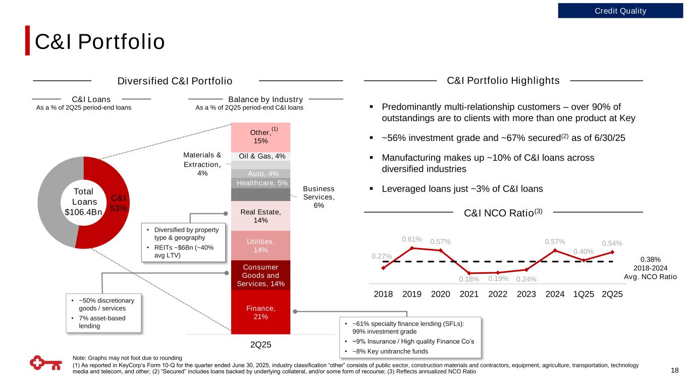 0.24% 0.29% 0.24% 0.26% 0.46% 0.43% 0.18% 0.14% 0.21% 0.41% 0.41% 2015 2016 2017 2018 2019 2020 2021 2022 2023 2024 1H25 Strong Credit Quality 17 (1) 1H25 reflects annualized NCO Ratio; (2) For 2015-2024; (3) Loan data based on 6/30/2025 ending balances 53% 16% 2% 18% 6% 5% 1% Diversified Loan Portfolio(3) Home Equity C&I Credit Cards Commercial Lease Financing Other Consumer CRE Residential Mortgage Nonperforming Loans Net Loan Charge-offs(1) As a % of average total loans 10-year average(2): 0.29% Credit Quality Improved credit risk profile with strategic exits (e.g., indirect auto and vendor finance) and growth in targeted client segments Ratios as a % of period-end portfolio loans; $ in millions $785 $454 $387 $574 $758 $696 0.78% 0.45% 0.32% 0.51% 0.73% 0.65% 100 300 500 700 900 1100 1300 0.000 0.002 0.004 0.006 0.008 4Q20 4Q21 4Q22 4Q23 4Q24 2Q25