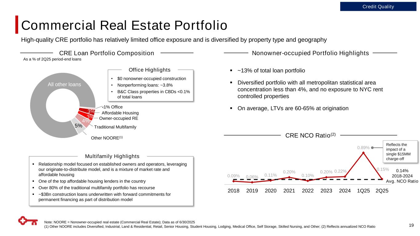 Finance, 21% Consumer Goods and Services, 14% Utilities, 14% Real Estate, 14% Business Services, 6% Healthcare, 5% Auto, 4% Materials & Extraction, 4% Oil & Gas, 4% Other, 15% 2Q25 18 Note: Graphs may not foot due to rounding (1) As reported in KeyCorp’s Form 10-Q for the quarter ended June 30, 2025, industry classification “other” consists of public sector, construction materials and contractors, equipment, agriculture, transportation, technology media and telecom, and other; (2) “Secured” includes loans backed by underlying collateral, and/or some form of recourse; (3) Reflects annualized NCO Ratio 0.27% 0.61% 0.57% 0.18% 0.19% 0.24% 0.57% 0.40% 0.54% 2018 2019 2020 2021 2022 2023 2024 1Q25 2Q25 C&I NCO Ratio(3) Diversified C&I Portfolio Total Loans $106.4Bn C&I Portfolio Highlights ▪ Predominantly multi-relationship customers – over 90% of outstandings are to clients with more than one product at Key ▪ ~56% investment grade and ~67% secured(2) as of 6/30/25 ▪ Manufacturing makes up ~10% of C&I loans across diversified industries ▪ Leveraged loans just ~3% of C&I loans C&I 53% 0.38% 2018-2024 Avg. NCO Ratio • Diversified by property type & geography • REITs ~$6Bn (~40% avg LTV) Credit Quality C&I Portfolio C&I Loans As a % of 2Q25 period-end loans Balance by Industry As a % of 2Q25 period-end C&I loans (1) • ~50% discretionary goods / services • 7% asset-based lending • ~61% specialty finance lending (SFLs): 99% investment grade • ~9% Insurance / High quality Finance Co’s • ~8% Key unitranche funds