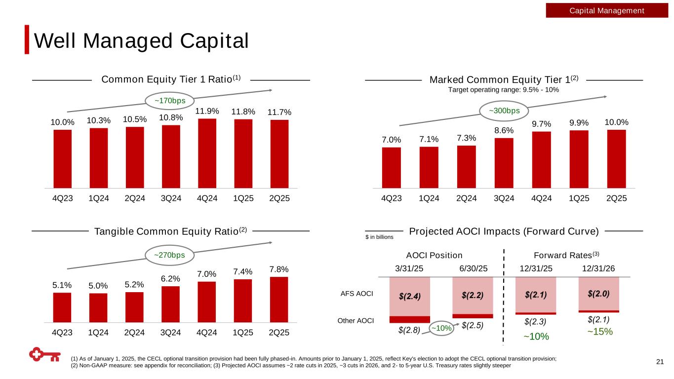 20 Note: Data as of 6/30/2025, totals may not foot due to rounding (1) Consumer unsecured consists of student loans, consumer credit card, and other consumer unsecured loans; (2) Excludes stale or unavailable FICO scores, which is 2% of the consumer portfolio; (3) Reflects annualized NCO Ratio High-quality, mostly secured portfolio with low loss history 3% 8% 11% 76% <640 640-719 720-759 760+ 18% 6% 5% All other loans As a % Total Loans Loan Portfolio Composition Consumer Portfolio Highlights ▪ Consumer credit trends remain healthy and stable - Weighted average consumer FICO of 790 ▪ ~81% of the portfolio is secured by real estate ▪ Student lending represents ~61% of unsecured outstandings; Credit card portfolio <$1Bn ▪ Intentionally running off low-yielding residential mortgage loans at a 3.3% weighted-average rate Residential Mortgage Home Equity Consumer Unsecured(1) <1% Other Consumer Secured • NCO ratio: 1.65% • 30-89 delinquencies: 0.58% • 90+ delinquencies: 0.33% Unsecured Highlights Portfolio Current FICO Scores(2) As a % of 2Q25 period-end loans 0.39% 0.41% 0.27% 0.21% 0.12% 0.19% 0.29% 0.29% 0.25% 2018 2019 2020 2021 2022 2023 2024 1Q25 2Q25 0.27% 2018-2024 Avg. NCO Ratio Consumer Portfolio Credit Quality Consumer NCO Ratio(3)