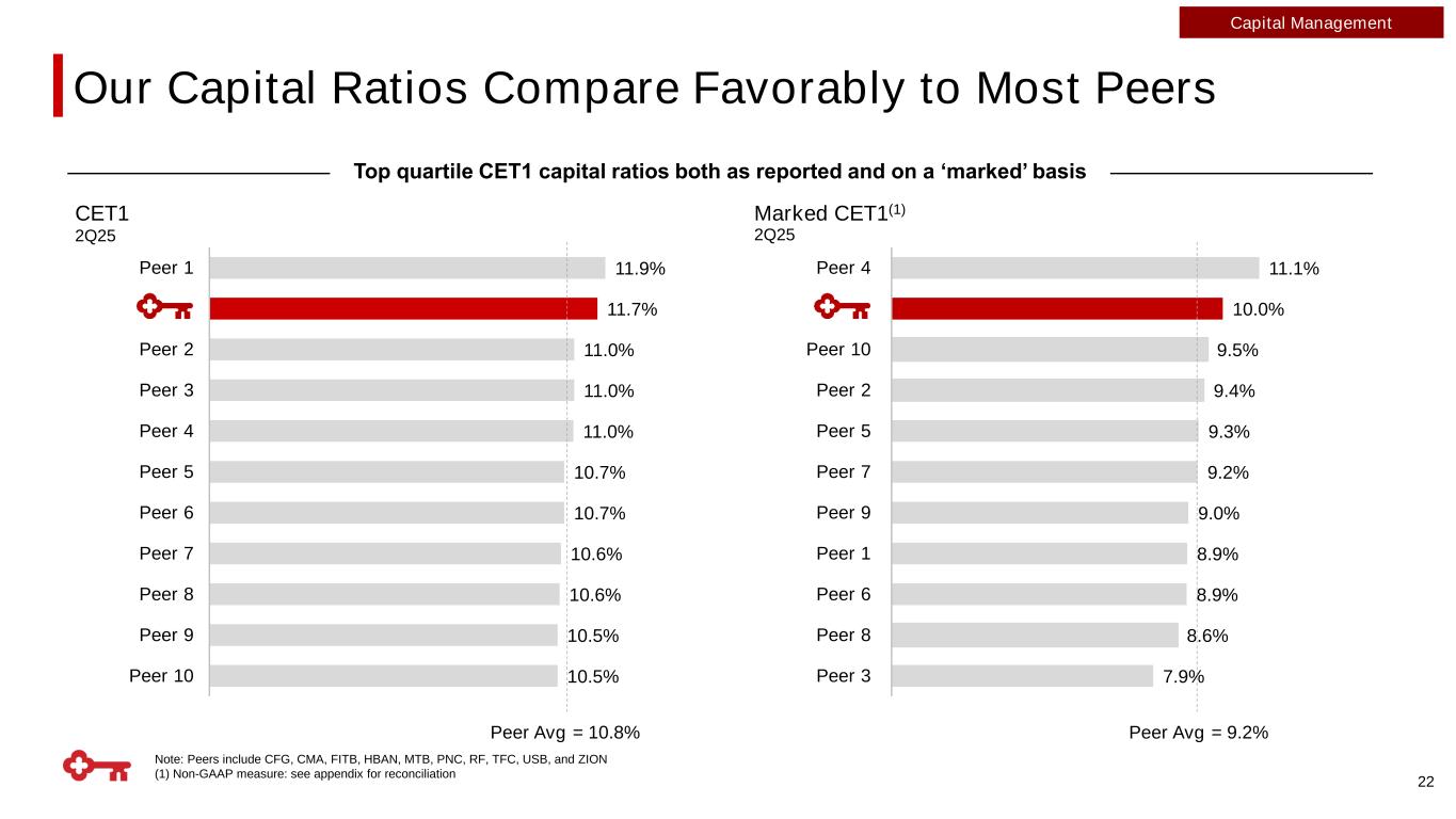 7.0% 7.1% 7.3% 8.6% 9.7% 9.9% 10.0% 4Q23 1Q24 2Q24 3Q24 4Q24 1Q25 2Q25 5.1% 5.0% 5.2% 6.2% 7.0% 7.4% 7.8% 4Q23 1Q24 2Q24 3Q24 4Q24 1Q25 2Q25 10.0% 10.3% 10.5% 10.8% 11.9% 11.8% 11.7% 4Q23 1Q24 2Q24 3Q24 4Q24 1Q25 2Q25 Capital Management (1) As of January 1, 2025, the CECL optional transition provision had been fully phased-in. Amounts prior to January 1, 2025, reflect Key's election to adopt the CECL optional transition provision; (2) Non-GAAP measure: see appendix for reconciliation; (3) Projected AOCI assumes ~2 rate cuts in 2025, ~3 cuts in 2026, and 2- to 5-year U.S. Treasury rates slightly steeper Tangible Common Equity Ratio(2) Common Equity Tier 1 Ratio(1) Marked Common Equity Tier 1(2) ~170bps ~300bps $ in billions Projected AOCI Impacts (Forward Curve) ~15% Forward Rates(3)AOCI Position 3/31/25 ~10% 12/31/25 12/31/26 AFS AOCI Other AOCI 6/30/25 ~10% Target operating range: 9.5% - 10% 21 ~270bps Well Managed Capital