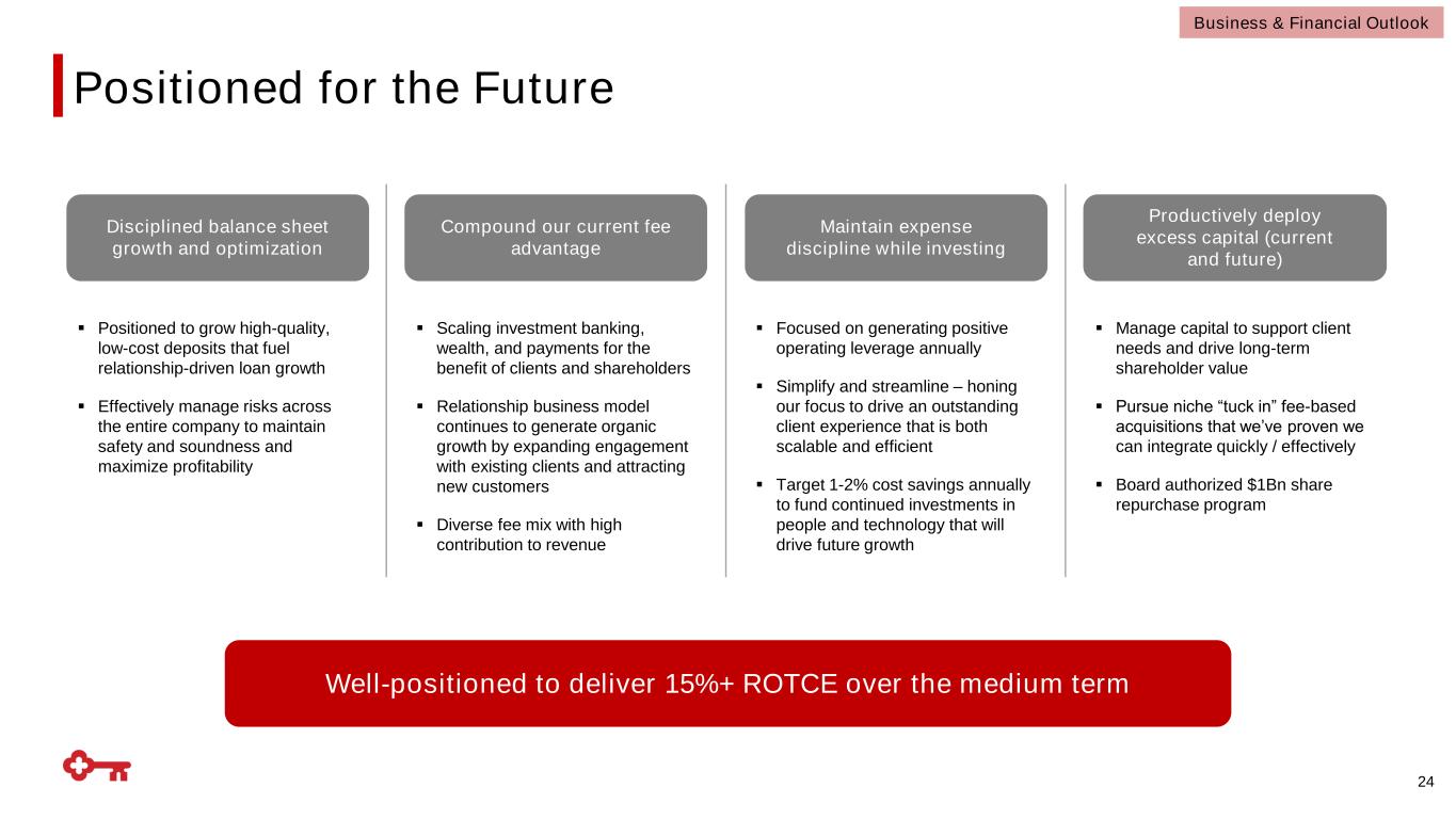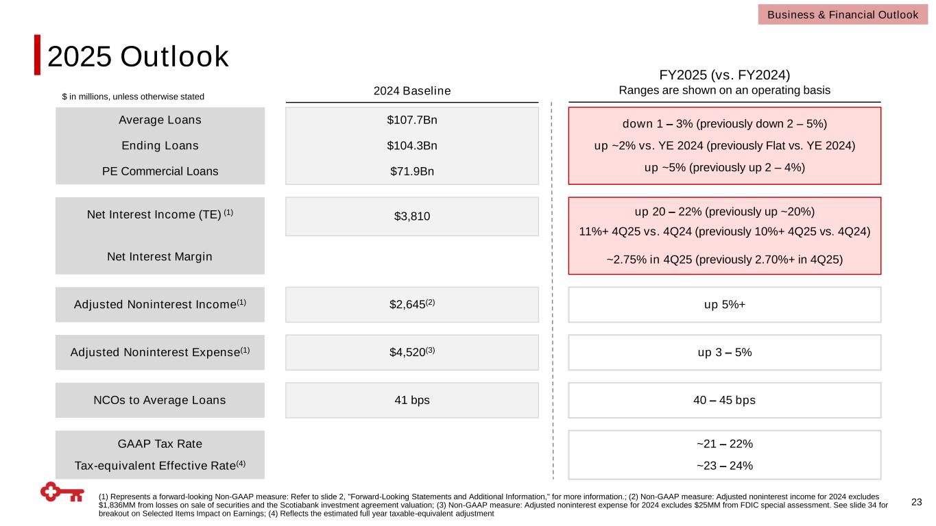 (1) Represents a forward-looking Non-GAAP measure: Refer to slide 2, "Forward-Looking Statements and Additional Information," for more information.; (2) Non-GAAP measure: Adjusted noninterest income for 2024 excludes $1,836MM from losses on sale of securities and the Scotiabank investment agreement valuation; (3) Non-GAAP measure: Adjusted noninterest expense for 2024 excludes $25MM from FDIC special assessment. See slide 34 for breakout on Selected Items Impact on Earnings; (4) Reflects the estimated full year taxable-equivalent adjustment FY2025 (vs. FY2024) Ranges are shown on an operating basis $ in millions, unless otherwise stated 2024 Baseline $107.7Bn $104.3Bn $71.9Bn down 1 – 3% (previously down 2 – 5%) up ~2% vs. YE 2024 (previously Flat vs. YE 2024) up ~5% (previously up 2 – 4%) Average Loans Ending Loans PE Commercial Loans $2,645(2) up 5%+Adjusted Noninterest Income(1) $4,520(3) up 3 – 5%Adjusted Noninterest Expense(1) $3,810 up 20 – 22% (previously up ~20%) 11%+ 4Q25 vs. 4Q24 (previously 10%+ 4Q25 vs. 4Q24) ~2.75% in 4Q25 (previously 2.70%+ in 4Q25) Net Interest Income (TE) (1) Net Interest Margin ~21 – 22% ~23 – 24% GAAP Tax Rate Tax-equivalent Effective Rate(4) 41 bps 40 – 45 bpsNCOs to Average Loans 23 Business & Financial Outlook 2025 Outlook