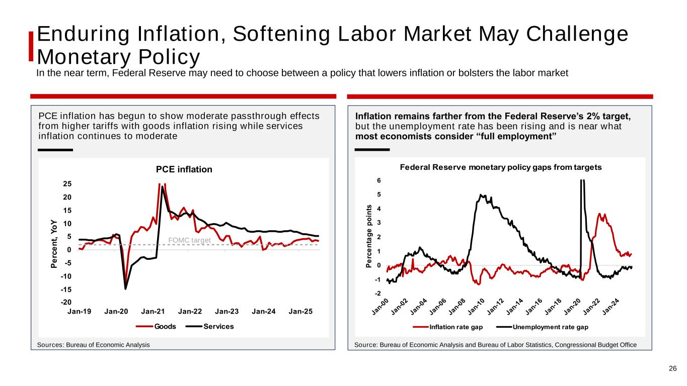 Enduring Inflation, Softening Labor Market May Challenge Monetary Policy In the near term, Federal Reserve may need to choose between a policy that lowers inflation or bolsters the labor market PCE inflation has begun to show moderate passthrough effects from higher tariffs with goods inflation rising while services inflation continues to moderate Inflation remains farther from the Federal Reserve’s 2% target, but the unemployment rate has been rising and is near what most economists consider “full employment” Sources: Bureau of Economic Analysis Source: Bureau of Economic Analysis and Bureau of Labor Statistics, Congressional Budget Office 20 15 10 5 0 5 10 15 20 25 an 19 an 20 an 21 an 22 an 2 an 2 an 25 e rc e n t, o CE inflation oods Services FOMC target 2 1 0 1 2 5 e rc e n ta g e p o in ts Federal Reserve monetary policy gaps from targets Inflation rate gap Unemployment rate gap 26