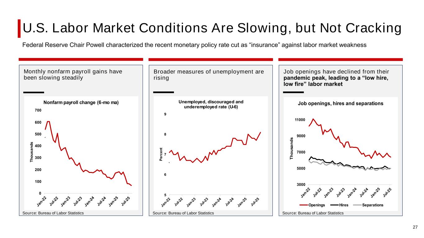 U.S. Labor Market Conditions Are Slowing, but Not Cracking Monthly nonfarm payroll gains have been slowing steadily Broader measures of unemployment are rising Job openings have declined from their pandemic peak, leading to a “low hire, low fire” labor market Source: Bureau of Labor Statistics Source: Bureau of Labor Statistics 0 100 200 00 00 500 00 00 T h o u s a n d s Nonfarm payroll change mo ma 5 9 e rc e n t Unemployed, discouraged and underemployed rate U 000 5000 000 9000 11000 T h o u s a n d s ob openings, hires and separations penings Hires Separations Source: Bureau of Labor Statistics Federal Reserve Chair Powell characterized the recent monetary policy rate cut as “insurance” against labor market weakness 27