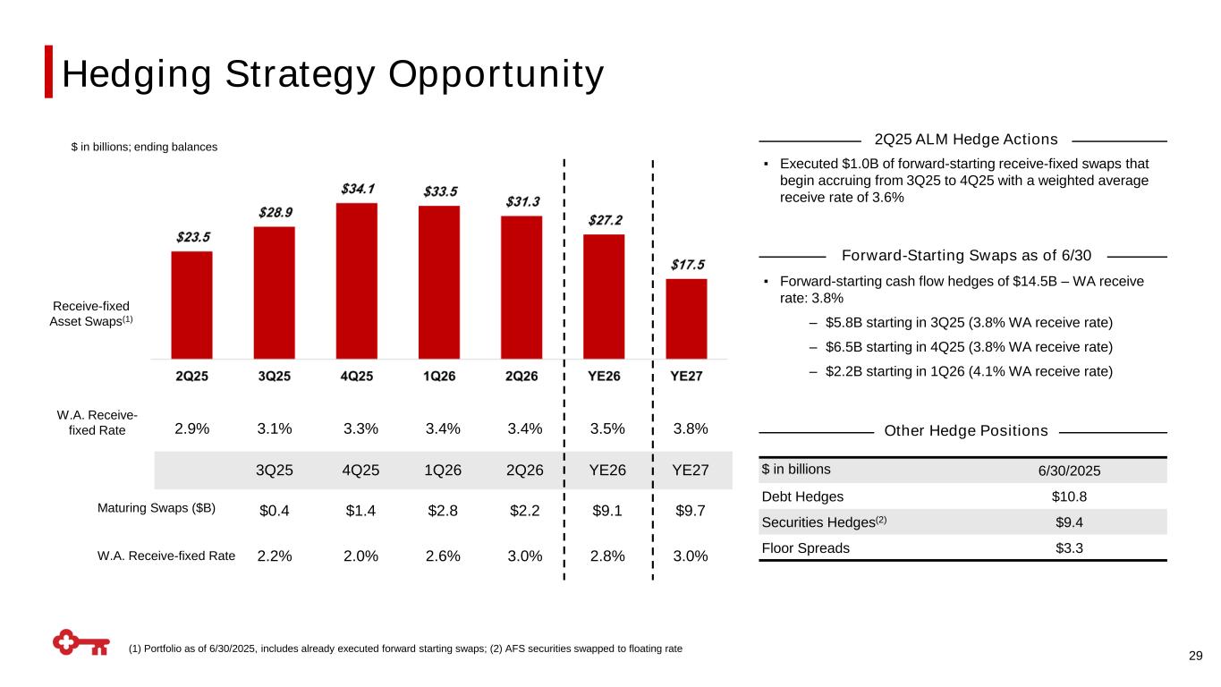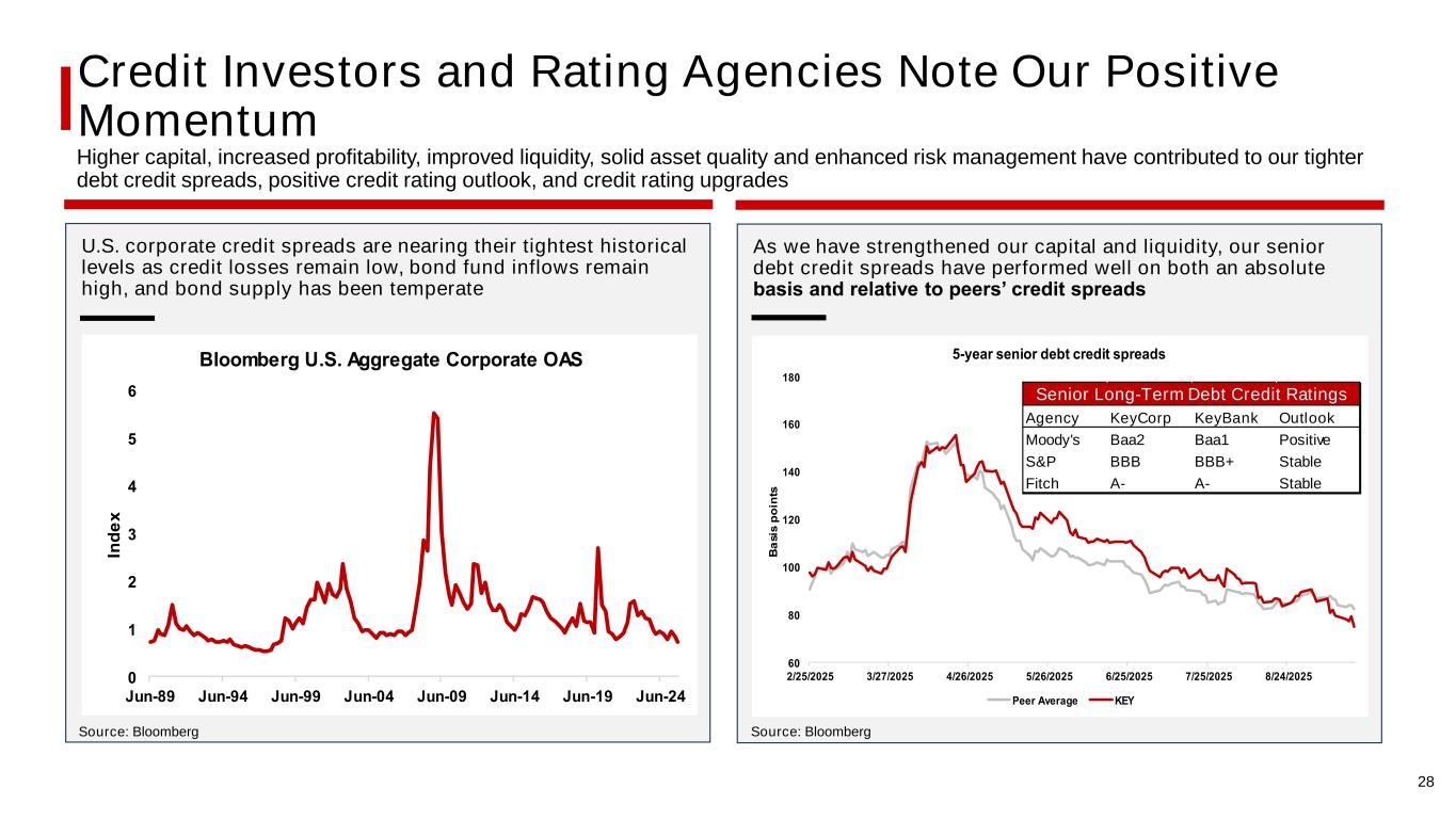 Credit Investors and Rating Agencies Note Our Positive Momentum Higher capital, increased profitability, improved liquidity, solid asset quality and enhanced risk management have contributed to our tighter debt credit spreads, positive credit rating outlook, and credit rating upgrades U.S. corporate credit spreads are nearing their tightest historical levels as credit losses remain low, bond fund inflows remain high, and bond supply has been temperate As we have strengthened our capital and liquidity, our senior debt credit spreads have performed well on both an absolute basis and relative to peers’ credit spreads Source: Bloomberg Source: Bloomberg 0 1 2 5 un 9 un 9 un 99 un 0 un 09 un 1 un 19 un 2 In d e loomberg U S ggregate Corporate S 0 0 100 120 1 0 1 0 1 0 2 25 2025 2 2025 2 2025 5 2 2025 25 2025 25 2025 2 2025 a s is p o in ts 5 year senior debt credit spreads eer verage E 28 Agency KeyCorp KeyBank Outlook Moody's Baa2 Baa1 Positive S&P BBB BBB+ Stable Fitch A- A- Stable Senior Long-Term Debt Credit Ratings