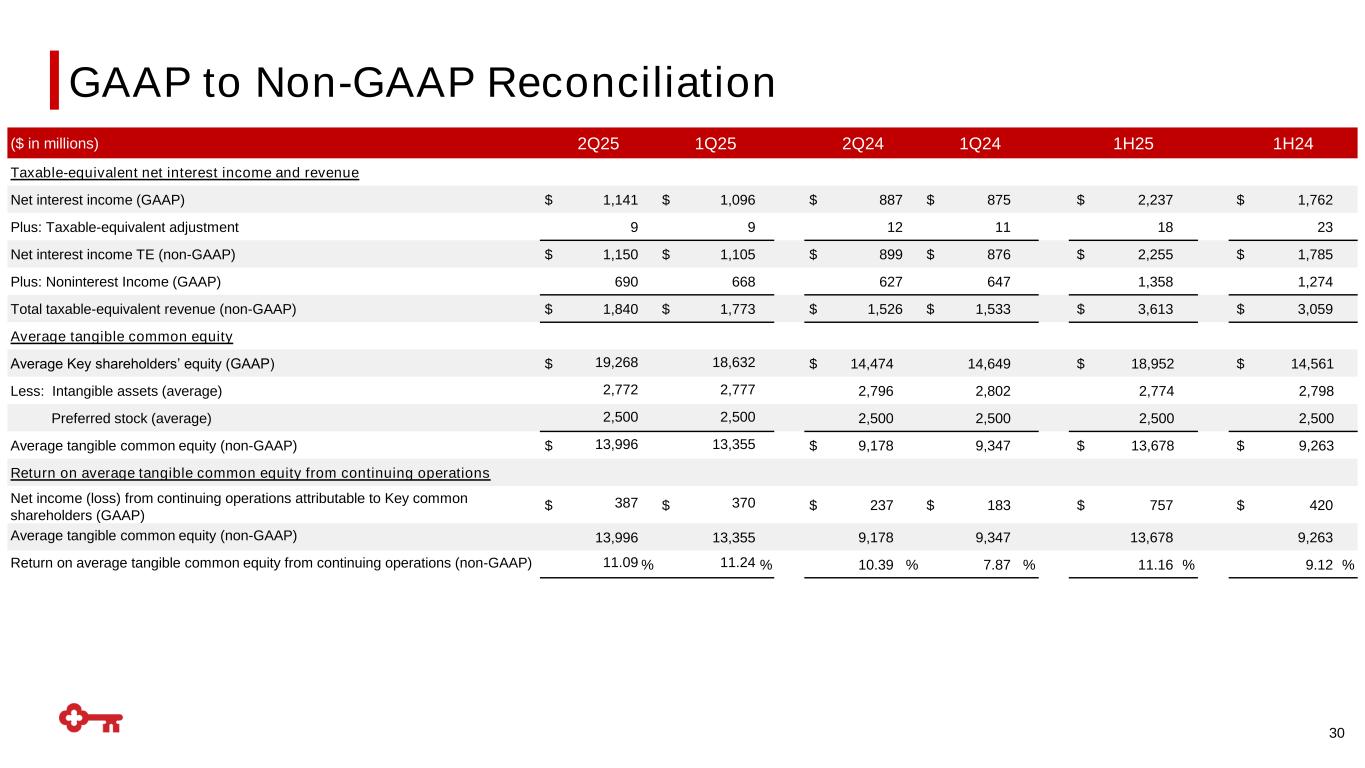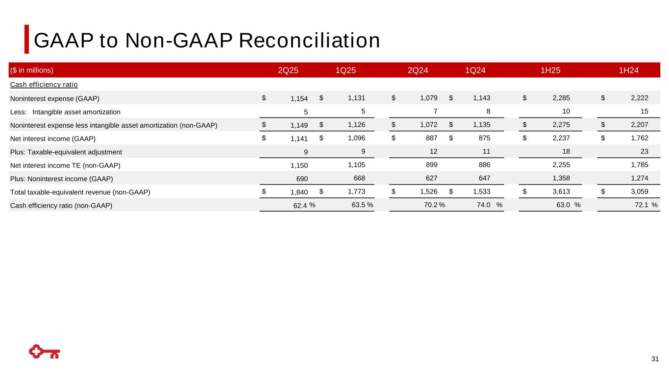 30 ($ in millions) 2Q25 1Q25 2Q24 1Q24 1H25 1H24 Taxable-equivalent net interest income and revenue Net interest income (GAAP) $ 1,141 $ 1,096 $ 887 $ 875 $ 2,237 $ 1,762 Plus: Taxable-equivalent adjustment 9 9 12 11 18 23 Net interest income TE (non-GAAP) $ 1,150 $ 1,105 $ 899 $ 876 $ 2,255 $ 1,785 Plus: Noninterest Income (GAAP) 690 668 627 647 1,358 1,274 Total taxable-equivalent revenue (non-GAAP) $ 1,840 $ 1,773 $ 1,526 $ 1,533 $ 3,613 $ 3,059 Average tangible common equity Average Key shareholders’ equity (GAAP) $ 19,268 18,632 $ 14,474 14,649 $ 18,952 $ 14,561 Less: Intangible assets (average) 2,772 2,777 2,796 2,802 2,774 2,798 Preferred stock (average) 2,500 2,500 2,500 2,500 2,500 2,500 Average tangible common equity (non-GAAP) $ 13,996 13,355 $ 9,178 9,347 $ 13,678 $ 9,263 Return on average tangible common equity from continuing operations Net income (loss) from continuing operations attributable to Key common shareholders (GAAP) $ 387 $ 370 $ 237 $ 183 $ 757 $ 420 Average tangible common equity (non-GAAP) 13,996 13,355 9,178 9,347 13,678 9,263 Return on average tangible common equity from continuing operations (non-GAAP) 11.09 % 11.24 % 10.39 % 7.87 % 11.16 % 9.12 % GAAP to Non-GAAP Reconciliation