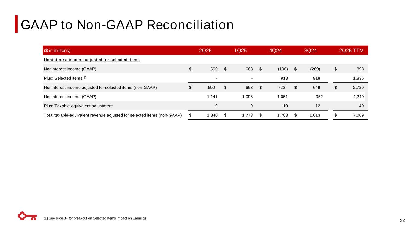 31 ($ in millions) 2Q25 1Q25 2Q24 1Q24 1H25 1H24 Cash efficiency ratio Noninterest expense (GAAP) $ 1,154 $ 1,131 $ 1,079 $ 1,143 $ 2,285 $ 2,222 Less: Intangible asset amortization 5 5 7 8 10 15 Noninterest expense less intangible asset amortization (non-GAAP) $ 1,149 $ 1,126 $ 1,072 $ 1,135 $ 2,275 $ 2,207 Net interest income (GAAP) $ 1,141 $ 1,096 $ 887 $ 875 $ 2,237 $ 1,762 Plus: Taxable-equivalent adjustment 9 9 12 11 18 23 Net interest income TE (non-GAAP) 1,150 1,105 899 886 2,255 1,785 Plus: Noninterest income (GAAP) 690 668 627 647 1,358 1,274 Total taxable-equivalent revenue (non-GAAP) $ 1,840 $ 1,773 $ 1,526 $ 1,533 $ 3,613 $ 3,059 Cash efficiency ratio (non-GAAP) 62.4 % 63.5 % 70.2 % 74.0 % 63.0 % 72.1 % GAAP to Non-GAAP Reconciliation