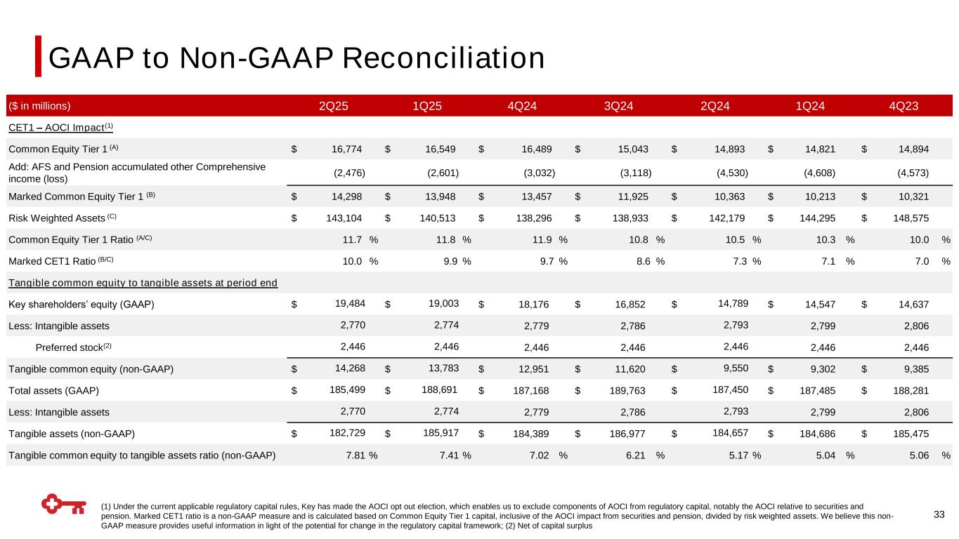 (1) Under the current applicable regulatory capital rules, Key has made the AOCI opt out election, which enables us to exclude components of AOCI from regulatory capital, notably the AOCI relative to securities and pension. Marked CET1 ratio is a non-GAAP measure and is calculated based on Common Equity Tier 1 capital, inclusive of the AOCI impact from securities and pension, divided by risk weighted assets. We believe this non- GAAP measure provides useful information in light of the potential for change in the regulatory capital framework; (2) Net of capital surplus 33 ($ in millions) 2Q25 1Q25 4Q24 3Q24 2Q24 1Q24 4Q23 CET1 – AOCI Impact(1) Common Equity Tier 1 (A) $ 16,774 $ 16,549 $ 16,489 $ 15,043 $ 14,893 $ 14,821 $ 14,894 Add: AFS and Pension accumulated other Comprehensive income (loss) (2,476) (2,601) (3,032) (3,118) (4,530) (4,608) (4,573) Marked Common Equity Tier 1 (B) $ 14,298 $ 13,948 $ 13,457 $ 11,925 $ 10,363 $ 10,213 $ 10,321 Risk Weighted Assets (C) $ 143,104 $ 140,513 $ 138,296 $ 138,933 $ 142,179 $ 144,295 $ 148,575 Common Equity Tier 1 Ratio (A/C) 11.7 % 11.8 % 11.9 % 10.8 % 10.5 % 10.3 % 10.0 % Marked CET1 Ratio (B/C) 10.0 % 9.9 % 9.7 % 8.6 % 7.3 % 7.1 % 7.0 % Tangible common equity to tangible assets at period end Key shareholders’ equity (GAAP) $ 19,484 $ 19,003 $ 18,176 $ 16,852 $ 14,789 $ 14,547 $ 14,637 Less: Intangible assets 2,770 2,774 2,779 2,786 2,793 2,799 2,806 Preferred stock(2) 2,446 2,446 2,446 2,446 2,446 2,446 2,446 Tangible common equity (non-GAAP) $ 14,268 $ 13,783 $ 12,951 $ 11,620 $ 9,550 $ 9,302 $ 9,385 Total assets (GAAP) $ 185,499 $ 188,691 $ 187,168 $ 189,763 $ 187,450 $ 187,485 $ 188,281 Less: Intangible assets 2,770 2,774 2,779 2,786 2,793 2,799 2,806 Tangible assets (non-GAAP) $ 182,729 $ 185,917 $ 184,389 $ 186,977 $ 184,657 $ 184,686 $ 185,475 Tangible common equity to tangible assets ratio (non-GAAP) 7.81 % 7.41 % 7.02 % 6.21 % 5.17 % 5.04 % 5.06 % GAAP to Non-GAAP Reconciliation