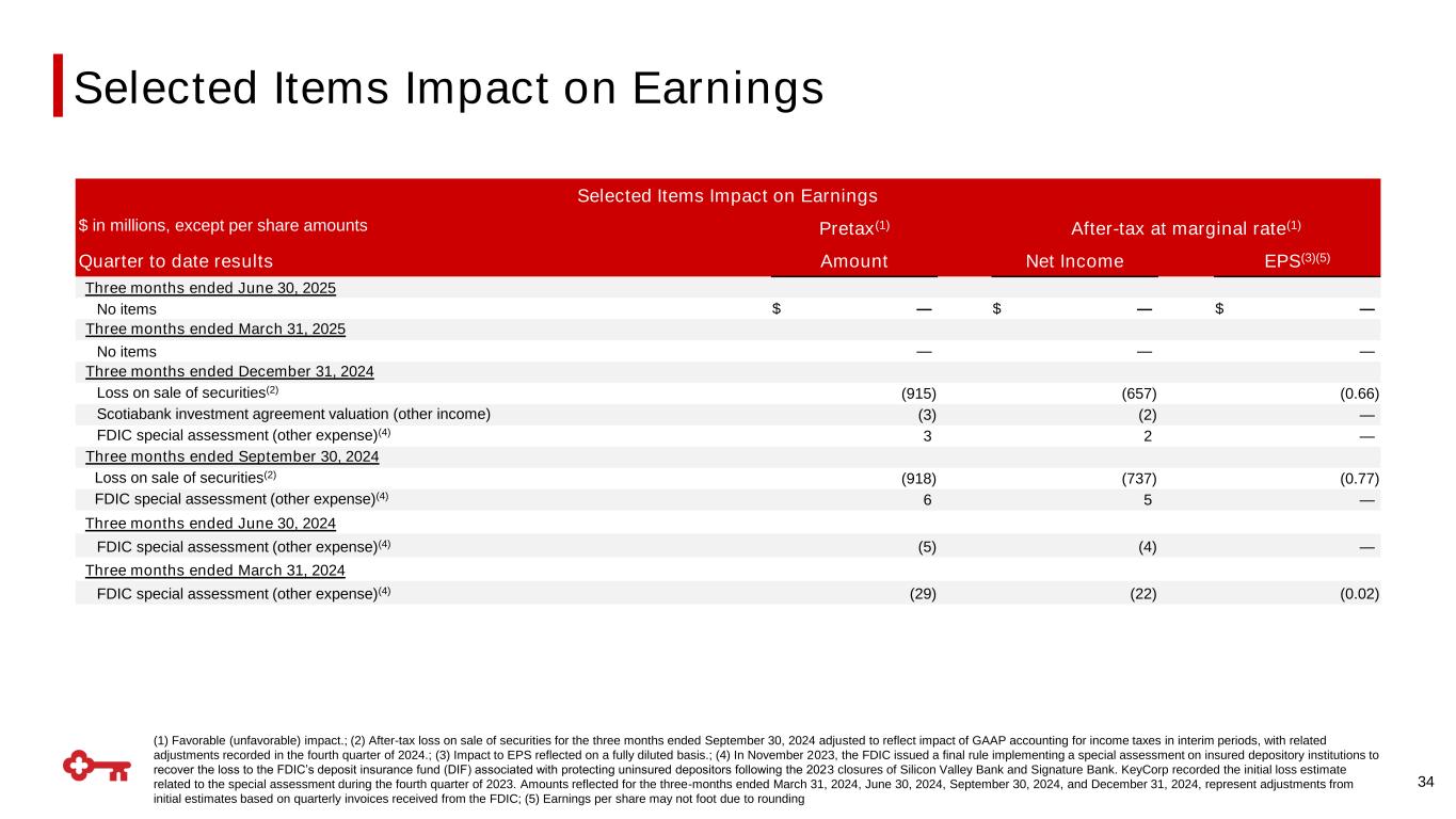 (1) Favorable (unfavorable) impact.; (2) After-tax loss on sale of securities for the three months ended September 30, 2024 adjusted to reflect impact of GAAP accounting for income taxes in interim periods, with related adjustments recorded in the fourth quarter of 2024.; (3) Impact to EPS reflected on a fully diluted basis.; (4) In November 2023, the FDIC issued a final rule implementing a special assessment on insured depository institutions to recover the loss to the FDIC’s deposit insurance fund (DIF) associated with protecting uninsured depositors following the 2023 closures of Silicon Valley Bank and Signature Bank. KeyCorp recorded the initial loss estimate related to the special assessment during the fourth quarter of 2023. Amounts reflected for the three-months ended March 31, 2024, June 30, 2024, September 30, 2024, and December 31, 2024, represent adjustments from initial estimates based on quarterly invoices received from the FDIC; (5) Earnings per share may not foot due to rounding Selected Items Impact on Earnings $ in millions, except per share amounts Pretax(1) After-tax at marginal rate(1) Quarter to date results Amount Net Income EPS(3)(5) Three months ended June 30, 2025 No items $ — $ — $ — Three months ended March 31, 2025 No items — — — Three months ended December 31, 2024 Loss on sale of securities(2) (915) (657) (0.66) Scotiabank investment agreement valuation (other income) (3) (2) — FDIC special assessment (other expense)(4) 3 2 — Three months ended September 30, 2024 Loss on sale of securities(2) (918) (737) (0.77) FDIC special assessment (other expense)(4) 6 5 — Three months ended June 30, 2024 FDIC special assessment (other expense)(4) (5) (4) — Three months ended March 31, 2024 FDIC special assessment (other expense)(4) (29) (22) (0.02) 34 Selected Items Impact on Earnings