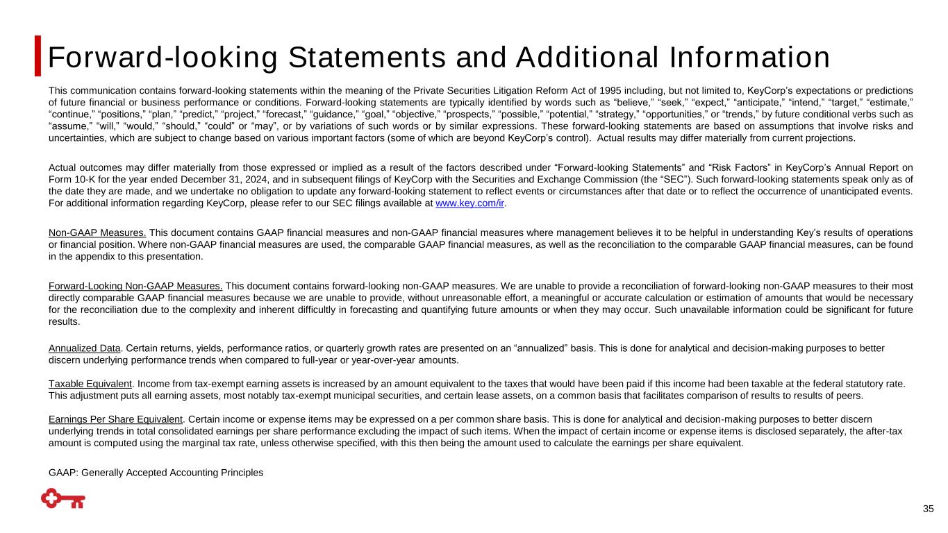 Forward-looking Statements and Additional Information 35 This communication contains forward-looking statements within the meaning of the Private Securities Litigation Reform Act of 1995 including, but not limited to, KeyCorp’s expectations or predictions of future financial or business performance or conditions. Forward-looking statements are typically identified by words such as “believe,” “seek,” “expect,” “anticipate,” “intend,” “target,” “estimate,” “continue,” “positions,” “plan,” “predict,” “project,” “forecast,” “guidance,” “goal,” “objective,” “prospects,” “possible,” “potential,” “strategy,” “opportunities,” or “trends,” by future conditional verbs such as “assume,” “will,” “would,” “should,” “could” or “may”, or by variations of such words or by similar expressions. These forward-looking statements are based on assumptions that involve risks and uncertainties, which are subject to change based on various important factors (some of which are beyond KeyCorp’s control). Actual results may differ materially from current projections. Actual outcomes may differ materially from those expressed or implied as a result of the factors described under “Forward-looking Statements” and “Risk Factors” in KeyCorp’s Annual Report on Form 10-K for the year ended December 31, 2024, and in subsequent filings of KeyCorp with the Securities and Exchange Commission (the “SEC”). Such forward-looking statements speak only as of the date they are made, and we undertake no obligation to update any forward-looking statement to reflect events or circumstances after that date or to reflect the occurrence of unanticipated events. For additional information regarding KeyCorp, please refer to our SEC filings available at www.key.com/ir. Non-GAAP Measures. This document contains GAAP financial measures and non-GAAP financial measures where management believes it to be helpful in understanding Key’s results of operations or financial position. Where non-GAAP financial measures are used, the comparable GAAP financial measures, as well as the reconciliation to the comparable GAAP financial measures, can be found in the appendix to this presentation. Forward-Looking Non-GAAP Measures. This document contains forward-looking non-GAAP measures. We are unable to provide a reconciliation of forward-looking non-GAAP measures to their most directly comparable GAAP financial measures because we are unable to provide, without unreasonable effort, a meaningful or accurate calculation or estimation of amounts that would be necessary for the reconciliation due to the complexity and inherent difficultly in forecasting and quantifying future amounts or when they may occur. Such unavailable information could be significant for future results. Annualized Data. Certain returns, yields, performance ratios, or quarterly growth rates are presented on an “annualized” basis. This is done for analytical and decision-making purposes to better discern underlying performance trends when compared to full-year or year-over-year amounts. Taxable Equivalent. Income from tax-exempt earning assets is increased by an amount equivalent to the taxes that would have been paid if this income had been taxable at the federal statutory rate. This adjustment puts all earning assets, most notably tax-exempt municipal securities, and certain lease assets, on a common basis that facilitates comparison of results to results of peers. Earnings Per Share Equivalent. Certain income or expense items may be expressed on a per common share basis. This is done for analytical and decision-making purposes to better discern underlying trends in total consolidated earnings per share performance excluding the impact of such items. When the impact of certain income or expense items is disclosed separately, the after-tax amount is computed using the marginal tax rate, unless otherwise specified, with this then being the amount used to calculate the earnings per share equivalent. GAAP: Generally Accepted Accounting Principles