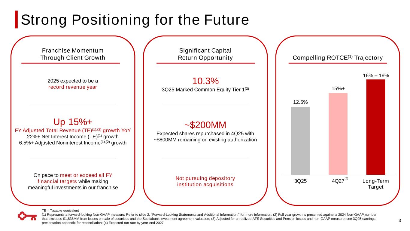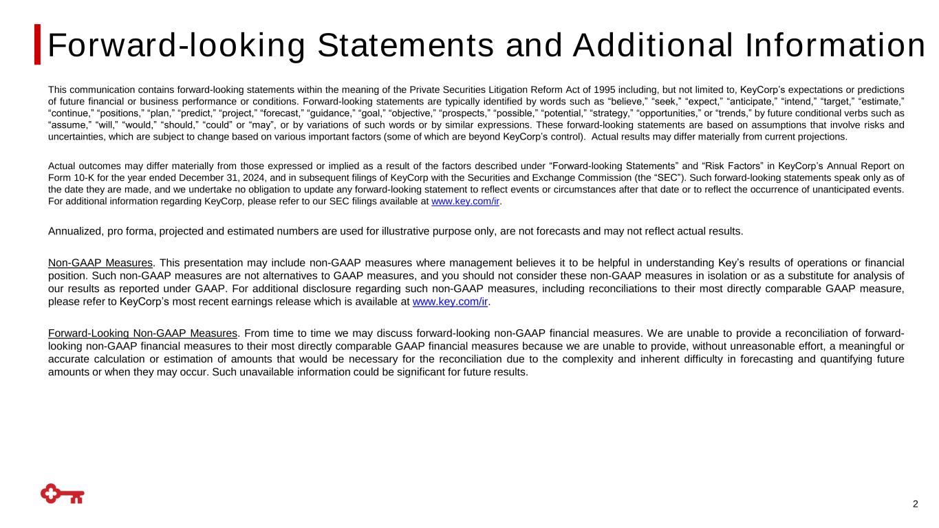This communication contains forward-looking statements within the meaning of the Private Securities Litigation Reform Act of 1995 including, but not limited to, KeyCorp’s expectations or predictions of future financial or business performance or conditions. Forward-looking statements are typically identified by words such as “believe,” “seek,” “expect,” “anticipate,” “intend,” “target,” “estimate,” “continue,” “positions,” “plan,” “predict,” “project,” “forecast,” “guidance,” “goal,” “objective,” “prospects,” “possible,” “potential,” “strategy,” “opportunities,” or “trends,” by future conditional verbs such as “assume,” “will,” “would,” “should,” “could” or “may”, or by variations of such words or by similar expressions. These forward-looking statements are based on assumptions that involve risks and uncertainties, which are subject to change based on various important factors (some of which are beyond KeyCorp’s control). Actual results may differ materially from current projections. Actual outcomes may differ materially from those expressed or implied as a result of the factors described under “Forward-looking Statements” and “Risk Factors” in KeyCorp’s Annual Report on Form 10-K for the year ended December 31, 2024, and in subsequent filings of KeyCorp with the Securities and Exchange Commission (the “SEC”). Such forward-looking statements speak only as of the date they are made, and we undertake no obligation to update any forward-looking statement to reflect events or circumstances after that date or to reflect the occurrence of unanticipated events. For additional information regarding KeyCorp, please refer to our SEC filings available at www.key.com/ir. Annualized, pro forma, projected and estimated numbers are used for illustrative purpose only, are not forecasts and may not reflect actual results. Non-GAAP Measures. This presentation may include non-GAAP measures where management believes it to be helpful in understanding Key’s results of operations or financial position. Such non-GAAP measures are not alternatives to GAAP measures, and you should not consider these non-GAAP measures in isolation or as a substitute for analysis of our results as reported under GAAP. For additional disclosure regarding such non-GAAP measures, including reconciliations to their most directly comparable GAAP measure, please refer to KeyCorp’s most recent earnings release which is available at www.key.com/ir. Forward-Looking Non-GAAP Measures. From time to time we may discuss forward-looking non-GAAP financial measures. We are unable to provide a reconciliation of forward- looking non-GAAP financial measures to their most directly comparable GAAP financial measures because we are unable to provide, without unreasonable effort, a meaningful or accurate calculation or estimation of amounts that would be necessary for the reconciliation due to the complexity and inherent difficulty in forecasting and quantifying future amounts or when they may occur. Such unavailable information could be significant for future results. Forward-looking Statements and Additional Information 2