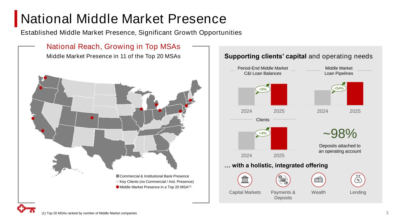 Commercial Bank (1) Source: BCG Global Payments Report 2025; (2) FY2022 - FY2025 • ~5K customers across 30 markets • Serving clients $10MM - $1B revenue • Total addressable market: 200K+ U.S. middle market businesses • ~$7Tn annual payments volume • Holistic platform, vertical expertise • Total addressable market: 3-4% North America annual payments industry growth(1) 2 Total Revenue 2025 Total Average Deposits 2025 Supporting Clients Across Industries & Geographies Meaningful Contributor to KEY Earnings & Returns ~$58Bn Commercial Deposits ~$2.1Bn Commercial Payments & Middle Market Growth & Returns Avg ROE across our Middle Market business(2) Commercial Payments Revenue CAGR over last 5 years~17-20% ~9% Middle Market Commercial Payments