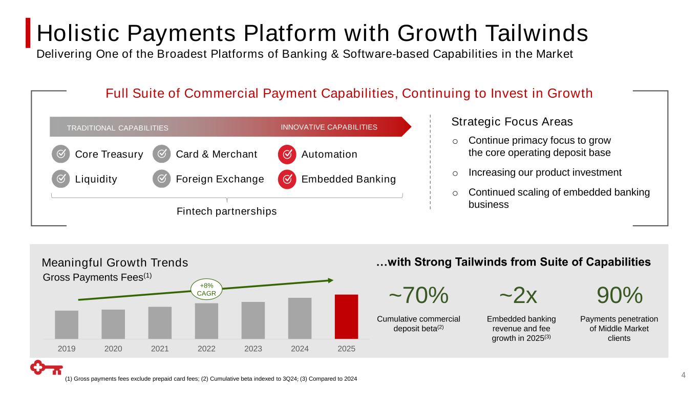 National Middle Market Presence Established Middle Market Presence, Significant Growth Opportunities 3 Middle Market Presence in 11 of the Top 20 MSAs 2024 2025 +9% Supporting clients’ capital and operating needs … with a holistic, integrated offering Payments & Deposits Wealth LendingCapital Markets National Reach, Growing in Top MSAs Commercial & Institutional Bank Presence Middle Market Presence in a Top 20 MSA(1) Key Clients (no Commercial / Inst. Presence) 2024 2025 +54% ~98% Deposits attached to an operating account 2024 2025 Clients Period-End Middle Market C&I Loan Balances Middle Market Loan Pipelines +4% (1) Top 20 MSAs ranked by number of Middle Market companies