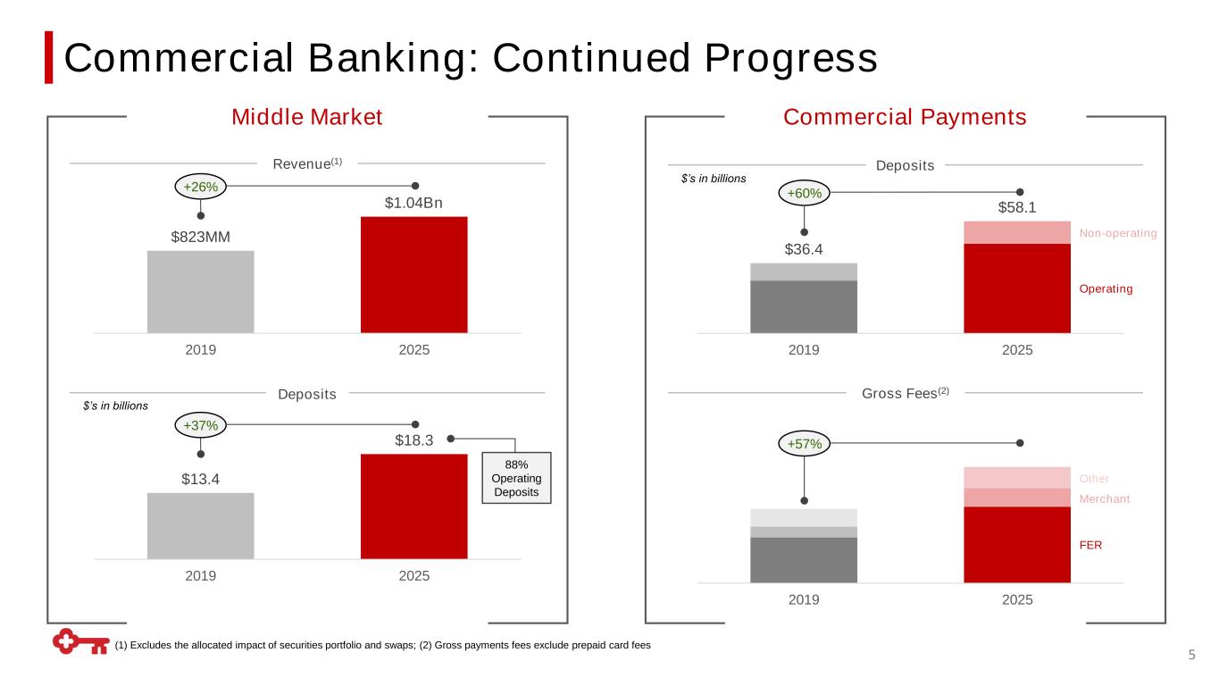 Fintech partnerships Holistic Payments Platform with Growth Tailwinds Delivering One of the Broadest Platforms of Banking & Software-based Capabilities in the Market 4 (1) Gross payments fees exclude prepaid card fees; (2) Cumulative beta indexed to 3Q24; (3) Compared to 2024 TRADITIONAL CAPABILITIES INNOVATIVE CAPABILITIES Core Treasury Liquidity Card & Merchant Foreign Exchange Automation Embedded Banking Strategic Focus Areas o Continue primacy focus to grow the core operating deposit base o Increasing our product investment o Continued scaling of embedded banking business 2019 2020 2021 2022 2023 2024 2025 ~2x 90% Payments penetration of Middle Market clients Embedded banking revenue and fee growth in 2025(3) Gross Payments Fees(1) Meaningful Growth Trends …with Strong Tailwinds from Suite of Capabilities +8% CAGR Full Suite of Commercial Payment Capabilities, Continuing to Invest in Growth ~70% Cumulative commercial deposit beta(2)