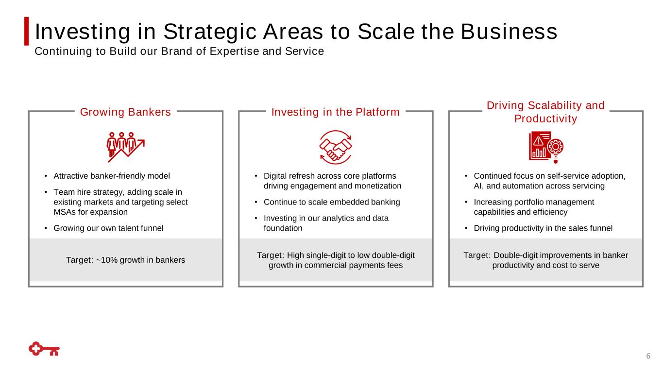 $36.4 $58.1 2019 2025 $13.4 $18.3 2019 2025 Commercial Banking: Continued Progress $823MM $1.04Bn 2019 2025 Revenue(1) Deposits +26% +37% (1) Excludes the allocated impact of securities portfolio and swaps; (2) Gross payments fees exclude prepaid card fees 2019 2025 Deposits Gross Fees(2) +60% Middle Market Commercial Payments +57% 5 FER Merchant Other $’s in billions $’s in billions 88% Operating Deposits Operating Non-operating