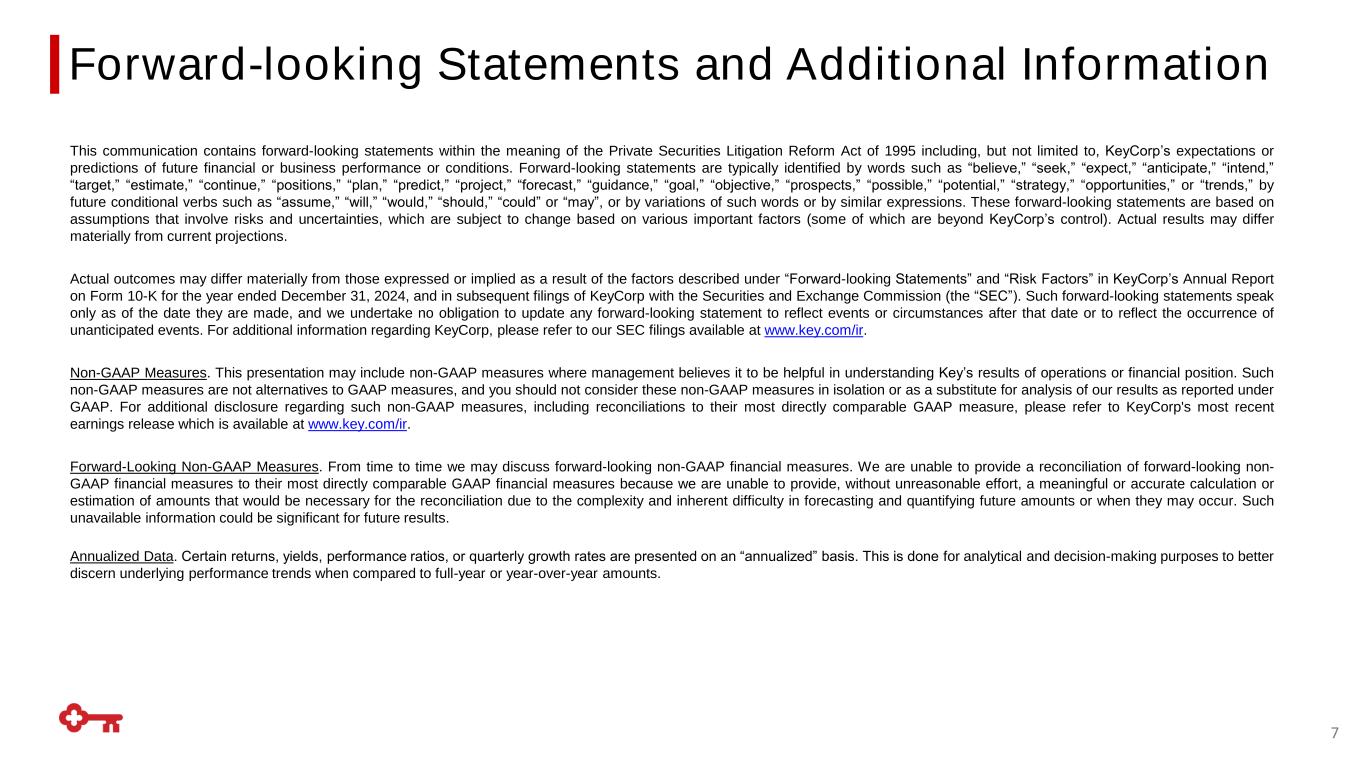 This communication contains forward-looking statements within the meaning of the Private Securities Litigation Reform Act of 1995 including, but not limited to, KeyCorp’s expectations or predictions of future financial or business performance or conditions. Forward-looking statements are typically identified by words such as “believe,” “seek,” “expect,” “anticipate,” “intend,” “target,” “estimate,” “continue,” “positions,” “plan,” “predict,” “project,” “forecast,” “guidance,” “goal,” “objective,” “prospects,” “possible,” “potential,” “strategy,” “opportunities,” or “trends,” by future conditional verbs such as “assume,” “will,” “would,” “should,” “could” or “may”, or by variations of such words or by similar expressions. These forward-looking statements are based on assumptions that involve risks and uncertainties, which are subject to change based on various important factors (some of which are beyond KeyCorp’s control). Actual results may differ materially from current projections. Actual outcomes may differ materially from those expressed or implied as a result of the factors described under “Forward-looking Statements” and “Risk Factors” in KeyCorp’s Annual Report on Form 10-K for the year ended December 31, 2024, and in subsequent filings of KeyCorp with the Securities and Exchange Commission (the “SEC”). Such forward-looking statements speak only as of the date they are made, and we undertake no obligation to update any forward-looking statement to reflect events or circumstances after that date or to reflect the occurrence of unanticipated events. For additional information regarding KeyCorp, please refer to our SEC filings available at www.key.com/ir. Non-GAAP Measures. This presentation may include non-GAAP measures where management believes it to be helpful in understanding Key’s results of operations or financial position. Such non-GAAP measures are not alternatives to GAAP measures, and you should not consider these non-GAAP measures in isolation or as a substitute for analysis of our results as reported under GAAP. For additional disclosure regarding such non-GAAP measures, including reconciliations to their most directly comparable GAAP measure, please refer to KeyCorp's most recent earnings release which is available at www.key.com/ir. Forward-Looking Non-GAAP Measures. From time to time we may discuss forward-looking non-GAAP financial measures. We are unable to provide a reconciliation of forward-looking non- GAAP financial measures to their most directly comparable GAAP financial measures because we are unable to provide, without unreasonable effort, a meaningful or accurate calculation or estimation of amounts that would be necessary for the reconciliation due to the complexity and inherent difficulty in forecasting and quantifying future amounts or when they may occur. Such unavailable information could be significant for future results. Annualized Data. Certain returns, yields, performance ratios, or quarterly growth rates are presented on an “annualized” basis. This is done for analytical and decision-making purposes to better discern underlying performance trends when compared to full-year or year-over-year amounts. Forward-looking Statements and Additional Information 7