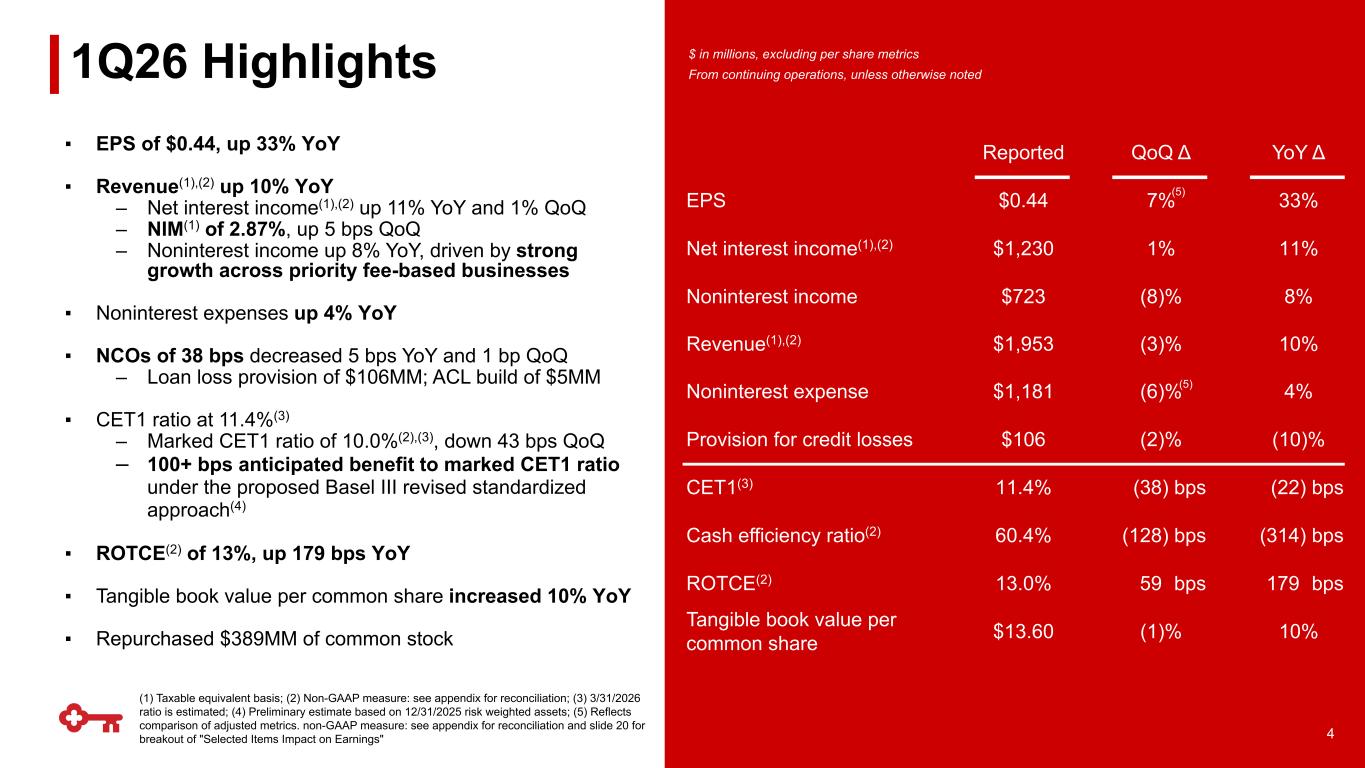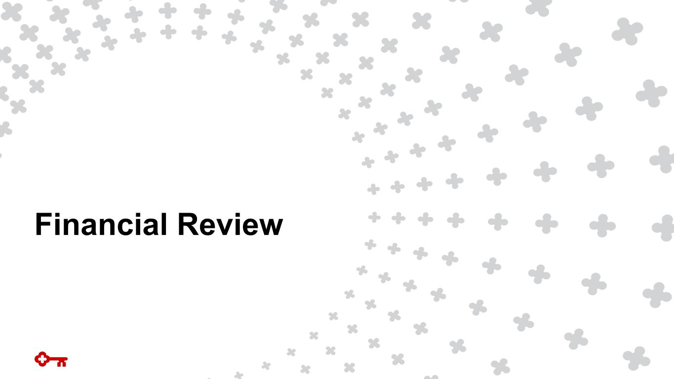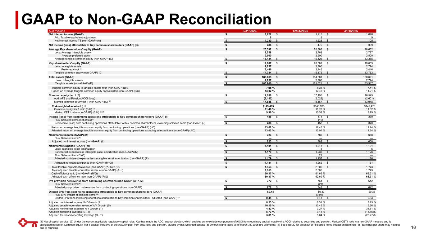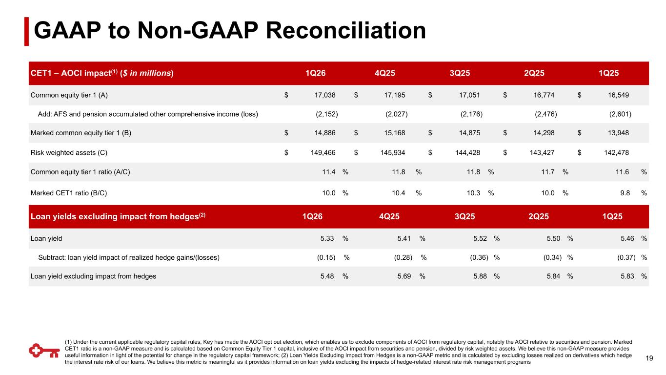 GAAP to Non-GAAP Reconciliation $ in millions 3/31/2026 12/31/2025 3/31/2025 Net interest income (GAAP) $ 1,222 $ 1,215 $ 1,096 Add: Taxable-equivalent adjustment 8 8 9 Net interest income TE (non-GAAP) (A) $ 1,230 $ 1,223 $ 1,105 Net income (loss) attributable to Key common shareholders (GAAP) (B) $ 486 $ 475 $ 369 Average Key shareholders' equity (GAAP) $ 20,392 $ 20,388 $ 18,632 Less: Average intangible assets 2,758 2,762 2,777 Average preferred stock 2,500 2,500 2,500 Average tangible common equity (non-GAAP) (C) $ 15,134 $ 15,126 $ 13,355 Key shareholders' equity (GAAP) $ 19,987 $ 20,381 $ 19,003 Less: Intangible assets 2,757 2,760 2,774 Preferred stock (1) 2,446 2,446 2,446 Tangible common equity (non-GAAP) (D) $ 14,784 $ 15,175 $ 13,783 Total assets (GAAP) $ 188,663 $ 184,381 $ 188,691 Less: Intangible assets 2,757 2,760 2,774 Tangible assets (non-GAAP) (E) $ 185,906 $ 181,621 $ 185,917 Tangible common equity to tangible assets ratio (non-GAAP) (D/E) 7.95 % 8.36 % 7.41 % Return on average tangible common equity consolidated (non-GAAP) (B/C) 13.02 % 12.46 % 11.21 % Common equity tier 1 (F) $ 17,038 $ 17,195 $ 16,549 Add: AFS and Pension AOCI (loss) (2,152) (2,028) (2,601) Marked common equity tier 1 (non-GAAP) (G) (2) $ 14,886 $ 15,167 $ 13,948 Risk-weighted assets (H) (3) $149,465 $145,933 $142,478 Common equity tier 1 ratio (F/H) (3) 11.40 % 11.78 % 11.62 % Marked CET1 ratio (non-GAAP) (G/H) (2),(3) 9.96 % 10.39 % 9.79 % Income (loss) from continuing operations attributable to Key common shareholders (GAAP) (I) $ 486 $ 474 $ 370 Plus: Selected items (net of tax)(4) — (16) — Net income (loss) from continuing operations attributable to Key common shareholders, excluding selected items (non-GAAP) (J) $ 486 $ 458 $ 370 Return on average tangible common equity from continuing operations (non-GAAP) (I/C) 13.02 % 12.43 % 11.24 % Adjusted return on average tangible common equity from continuing operations excluding selected items (non-GAAP) (J/C) 13.02 % 12.01 % 11.24 % Noninterest income (GAAP) (K) $ 723 $ 782 $ 668 Plus: Selected items(4) — — — Adjusted noninterest income (non-GAAP) (L) $ 723 $ 782 $ 668 Noninterest expense (GAAP) (M) $ 1,181 $ 1,241 $ 1,131 Less: Intangible asset amortization 2 5 5 Noninterest expense less intangible asset amortization (non-GAAP) (N) $ 1,179 $ 1,236 $ 1,126 Plus: Selected items(4) (O) — 21 — Adjusted noninterest expense less intangible asset amortization (non-GAAP) (P) $ 1,179 $ 1,257 $ 1,126 Adjusted noninterest expense (non-GAAP) (M+O) $ 1,181 $ 1,262 $ 1,131 Total taxable-equivalent revenue (non-GAAP) (A+K) = (Q) $ 1,953 $ 2,005 $ 1,773 Total adjusted taxable-equivalent revenue (non-GAAP) (A+L) 1,953 2,005 1,773 Cash efficiency ratio (non-GAAP) (N/Q) 60.37 % 61.65 % 63.51 % Adjusted cash efficiency ratio (non-GAAP) (P/Q) 60.37 % 62.69 % 63.51 % Pre-provision net revenue from continuing operations (non-GAAP) (A+K-M) $ 772 $ 764 $ 642 Plus: Selected items(4) — (21) — Adjusted pre-provison net revenue from continuing operations (non-GAAP) $ 772 $ 743 $ 642 Diluted EPS from continuing operations attributable to Key common shareholders (GAAP) $0.44 $0.43 $0.33 Plus: EPS impact of selected items (4) — (0.01) — Diluted EPS from continuing operations attributable to Key common shareholders - adjusted (non-GAAP) (5) $ 0.44 $ 0.41 $ 0.33 Adjusted noninterest income YoY Growth (R) 8.23 % 8.31 % 3.25 % Adjusted taxable-equivalent revenue YoY Growth (S) 10.15 % 12.45 % 15.66 % Adjusted noninterest expense YoY Growth (T) 4.42 % 3.27 % 31.51 % Adjusted operating leverage (S - T) 5.73 % 9.18 % (15.86) % Adjusted fee-based operating leverage (R - T) 3.81 % 5.04 % (28.27) % (1) Net of capital surplus; (2) Under the current applicable regulatory capital rules, Key has made the AOCI opt out election, which enables us to exclude components of AOCI from regulatory capital, notably the AOCI relative to securities and pension. Marked CET1 ratio is a non-GAAP measure and is calculated based on Common Equity Tier 1 capital, inclusive of the AOCI impact from securities and pension, divided by risk weighted assets; (3) Amounts and ratios as of March 31, 2026 are estimated; (4) See slide 20 for breakout of "Selected Items Impact on Earnings"; (5) Earnings per share may not foot due to rounding 18
