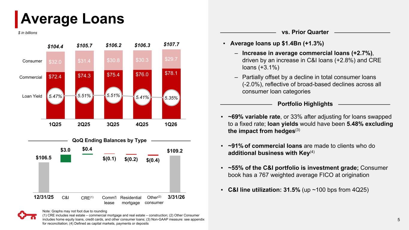 ▪ EPS of $0.44, up 33% YoY ▪ Revenue(1),(2) up 10% YoY – Net interest income(1),(2) up 11% YoY and 1% QoQ – NIM(1) of 2.87%, up 5 bps QoQ – Noninterest income up 8% YoY, driven by strong growth across priority fee-based businesses ▪ Noninterest expenses up 4% YoY ▪ NCOs of 38 bps decreased 5 bps YoY and 1 bp QoQ – Loan loss provision of $106MM; ACL build of $5MM ▪ CET1 ratio at 11.4%(3) – Marked CET1 ratio of 10.0%(2),(3), down 43 bps QoQ – 100+ bps anticipated benefit to marked CET1 ratio under the proposed Basel III revised standardized approach(4) ▪ ROTCE(2) of 13%, up 179 bps YoY ▪ Tangible book value per common share increased 10% YoY ▪ Repurchased $389MM of common stock Adjusted Noninterest Expense $1,262(2) 1Q26 Highlights $ in millions, excluding per share metrics From continuing operations, unless otherwise noted Reported QoQ Δ YoY Δ EPS $0.44 7% 33% Net interest income(1),(2) $1,230 1% 11% Noninterest income $723 (8)% 8% Revenue(1),(2) $1,953 (3)% 10% Noninterest expense $1,181 (6)% 4% Provision for credit losses $106 (2)% (10)% CET1(3) 11.4% (38) bps (22) bps Cash efficiency ratio(2) 60.4% (128) bps (314) bps ROTCE(2) 13.0% 59 bps 179 bps Tangible book value per common share $13.60 (1)% 10% 4 (1) Taxable equivalent basis; (2) Non-GAAP measure: see appendix for reconciliation; (3) 3/31/2026 ratio is estimated; (4) Preliminary estimate based on 12/31/2025 risk weighted assets; (5) Reflects comparison of adjusted metrics. non-GAAP measure: see appendix for reconciliation and slide 20 for breakout of "Selected Items Impact on Earnings" (5) (5)