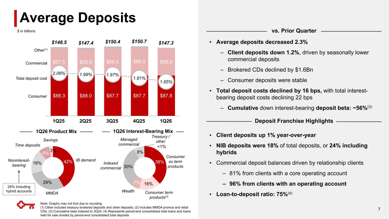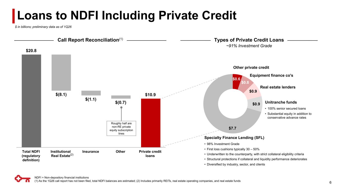 $106.5 $3.0 $0.4 $(0.1) $(0.2) $(0.4) $109.2 12/31/25 C&I CRE Comm'l lease Residential mortgage Other consumer 3/31/26 ▪ ~69% variable rate, or 33% after adjusting for loans swapped to a fixed rate; loan yields would have been 5.48% excluding the impact from hedges(3) ▪ ~91% of commercial loans are made to clients who do additional business with Key(4) ▪ ~55% of the C&I portfolio is investment grade; Consumer book has a 767 weighted average FICO at origination ▪ C&I line utilization: 31.5% (up ~100 bps from 4Q25) ▪ Average loans up $1.4Bn (+1.3%) – Increase in average commercial loans (+2.7%), driven by an increase in C&I loans (+2.8%) and CRE loans (+3.1%) – Partially offset by a decline in total consumer loans (-2.0%), reflective of broad-based declines across all consumer loan categories vs. Prior Quarter Portfolio Highlights Note: Graphs may not foot due to rounding (1) CRE includes real estate – commercial mortgage and real estate – construction; (2) Other Consumer includes home equity loans, credit cards, and other consumer loans; (3) Non-GAAP measure: see appendix for reconciliation; (4) Defined as capital markets, payments or deposits Average Loans Consumer Commercial Loan Yield $ in billions QoQ Ending Balances by Type 5 $104.4 $105.7 $106.2 $106.3 $107.7 $72.4 $74.3 $75.4 $76.0 $78.1 $32.0 $31.4 $30.8 $30.3 $29.7 5.47% 5.51% 5.51% 5.41% 5.35% 1Q25 2Q25 3Q25 4Q25 1Q26 12/ / 5 (2) consumer CRE(1) /31/26