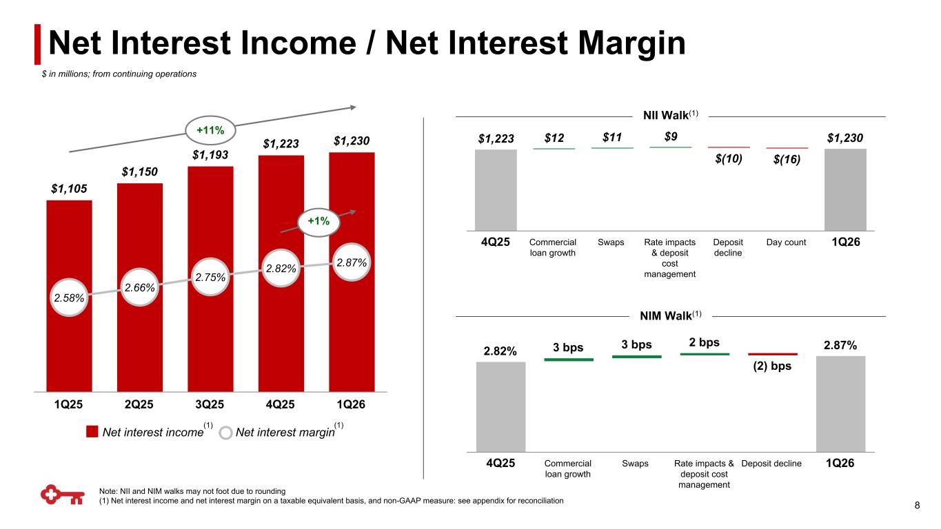 ▪ Average deposits decreased 2.3% – Client deposits down 1.2%, driven by seasonally lower commercial deposits – Brokered CDs declined by $1.6Bn – Consumer deposits were stable ▪ Total deposit costs declined by 16 bps, with total interest- bearing deposit costs declining 22 bps – Cumulative down interest-bearing deposit beta: ~56%(3) 38% 16%7% 30% 8% 0% 42% 29% 18% 8% 3% vs. Prior Quarter Deposit Franchise Highlights ▪ Client deposits up 1% year-over-year ▪ NIB deposits were 18% of total deposits, or 24% including hybrids ▪ Commercial deposit balances driven by relationship clients – 81% from clients with a core operating account – 96% from clients with an operating account ▪ Loan-to-deposit ratio: 75%(4) 1Q26 Product Mix Time deposits Savings Noninterest- bearing IB demand 1Q26 Interest-Bearing Mix Consumer ex term products <1% MMDA Managed commercial Indexed commercial Wealth Average Deposits Consumer Other(1) Commercial Total deposit cost Consumer term products(2) Note: Graphs may not foot due to rounding (1) Other includes treasury brokered deposits and other deposits; (2) Includes MMDA promos and retail CDs; (3) Cumulative beta indexed to 3Q24; (4) Represents period-end consolidated total loans and loans held for sale divided by period-end consolidated total deposits 24% including hybrid accounts Treasury / other 7 $148.5 $147.4 $150.4 $150.7 $147.3 $88.3 $88.0 $87.7 $87.7 $87.8 $57.5 $55.9 $58.5 $60.5 $58.9 2.06% 1.99% 1.97% 1.81% 1.65% 1Q25 2Q25 3Q25 4Q25 1Q26 $ in billions