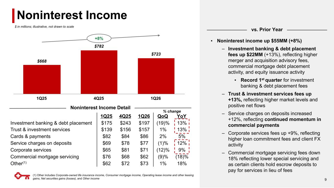 $1,223 $12 $11 $9 $(10) $(16) $1,230 Commercial loan growth Swaps Rate impacts & deposit cost management Deposit decline Day count $1,105 $1,150 $1,193 $1,223 $1,230 2.58% 2.66% 2.75% 2.82% 2.87% Net interest income Net interest margin 1Q25 2Q25 3Q25 4Q25 1Q26 Note: NII and NIM walks may not foot due to rounding (1) Net interest income and net interest margin on a taxable equivalent basis, and non-GAAP measure: see appendix for reconciliation Net Interest Income / Net Interest Margin +1% +11% NII Walk(1) NIM Walk(1) 8 2.82% 3 bps 3 bps 2 bps (2) bps 2.87% Commercial loan growth Swaps Rate impacts & deposit cost management Deposit decline $ in millions; from continuing operations 4Q25 1Q26 4Q25 1Q26 (1))(1)