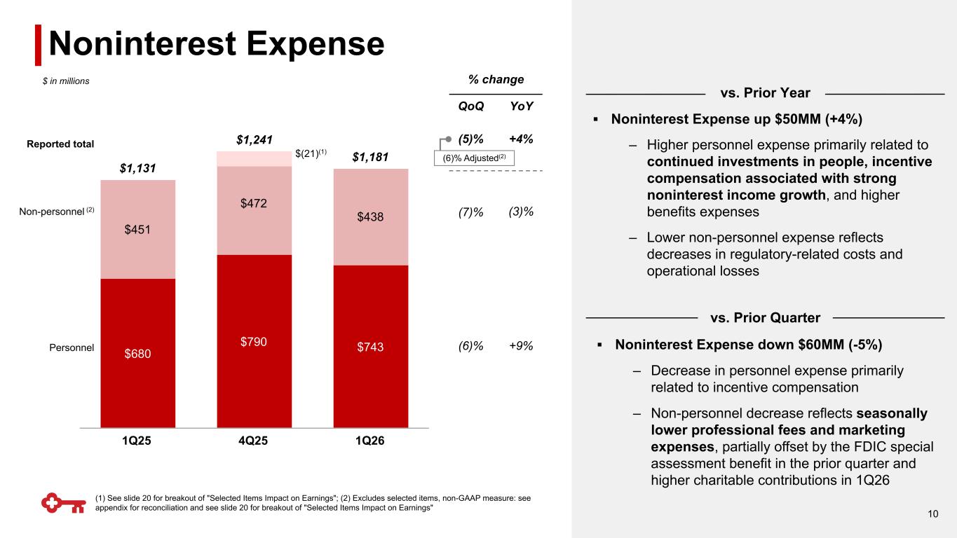 $668 $782 $723 1Q25 4Q25 1Q26 1Q25 4Q25 1Q26 QoQ YoY Investment banking & debt placement $175 $243 $197 (19)% 13% Trust & investment services $139 $156 $157 1% 13% Cards & payments $82 $84 $86 2% 5% Service charges on deposits $69 $78 $77 (1)% 12% Corporate services $65 $81 $71 (12)% 9% Commercial mortgage servicing $76 $68 $62 (9)% (18)% Other(1) $62 $72 $73 1% 18% (1) Other includes Corporate-owned life insurance income, Consumer mortgage income, Operating lease income and other leasing gains, Net securities gains (losses), and Other income Noninterest Income Noninterest Income Detail % change vs. Prior Year 9 $ in millions; illustrative, not drawn to scale +8% ▪ Noninterest income up $55MM (+8%) – Investment banking & debt placement fees up $22MM (+13%), reflecting higher merger and acquisition advisory fees, commercial mortgage debt placement activity, and equity issuance activity ▪ Record 1st quarter for investment banking & debt placement fees – Trust & investment services fees up +13%, reflecting higher market levels and positive net flows – Service charges on deposits increased +12%, reflecting continued momentum in commercial payments – Corporate services fees up +9%, reflecting higher loan commitment fees and client FX activity – Commercial mortgage servicing fees down 18% reflecting lower special servicing and as certain clients hold escrow deposits to pay for services in lieu of fees