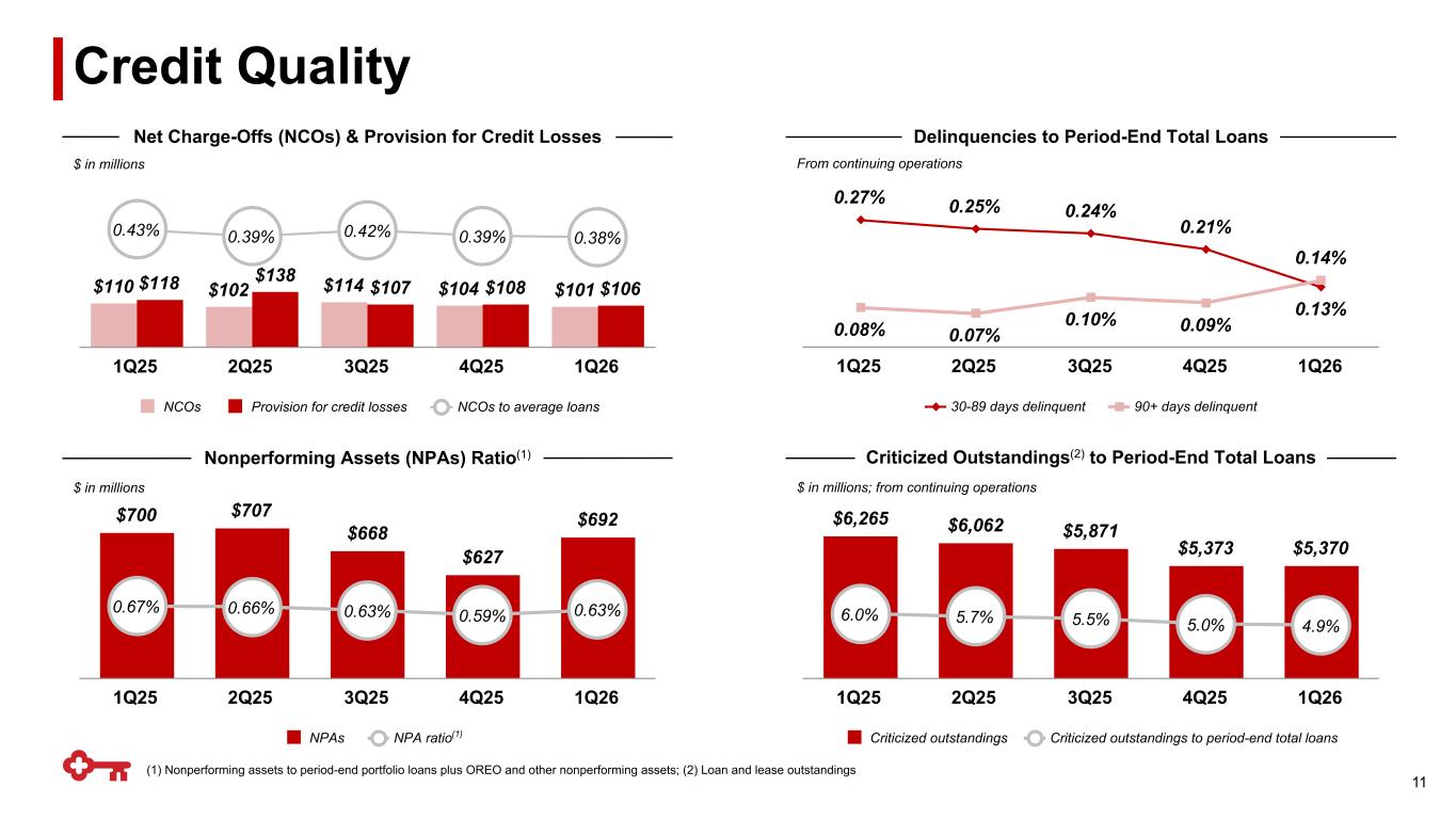 $1,131 $1,241 $1,181 $680 $790 $743 $451 $472 $438 1Q25 4Q25 1Q26 ▪ Noninterest Expense up $50MM (+4%) – Higher personnel expense primarily related to continued investments in people, incentive compensation associated with strong noninterest income growth, and higher benefits expenses – Lower non-personnel expense reflects decreases in regulatory-related costs and operational losses (3)% Personnel Non-personnel (2) YoY +9% +4% QoQ (7)% (6)% (5)% $ in millions Noninterest Expense vs. Prior Quarter % change vs. Prior Year (1) See slide 20 for breakout of "Selected Items Impact on Earnings"; (2) Excludes selected items, non-GAAP measure: see appendix for reconciliation and see slide 20 for breakout of "Selected Items Impact on Earnings" 10 $(21)(1) 1Q26 Notable Expenses ▪ Pull forward of $25MM charitable contribution originally planned in back half of the year Reported total ▪ Noninterest Expense down $60MM (-5%) – Decrease in personnel expense primarily related to incentive compensation – Non-personnel decrease reflects seasonally lower professional fees and marketing expenses, partially offset by the FDIC special assessment benefit in the prior quarter and higher charitable contributions in 1Q26 1Q26 Notable Expenses: $25MM charitable contribution pulled forward, originally planned in back half of the year (6)% Adjusted(2)