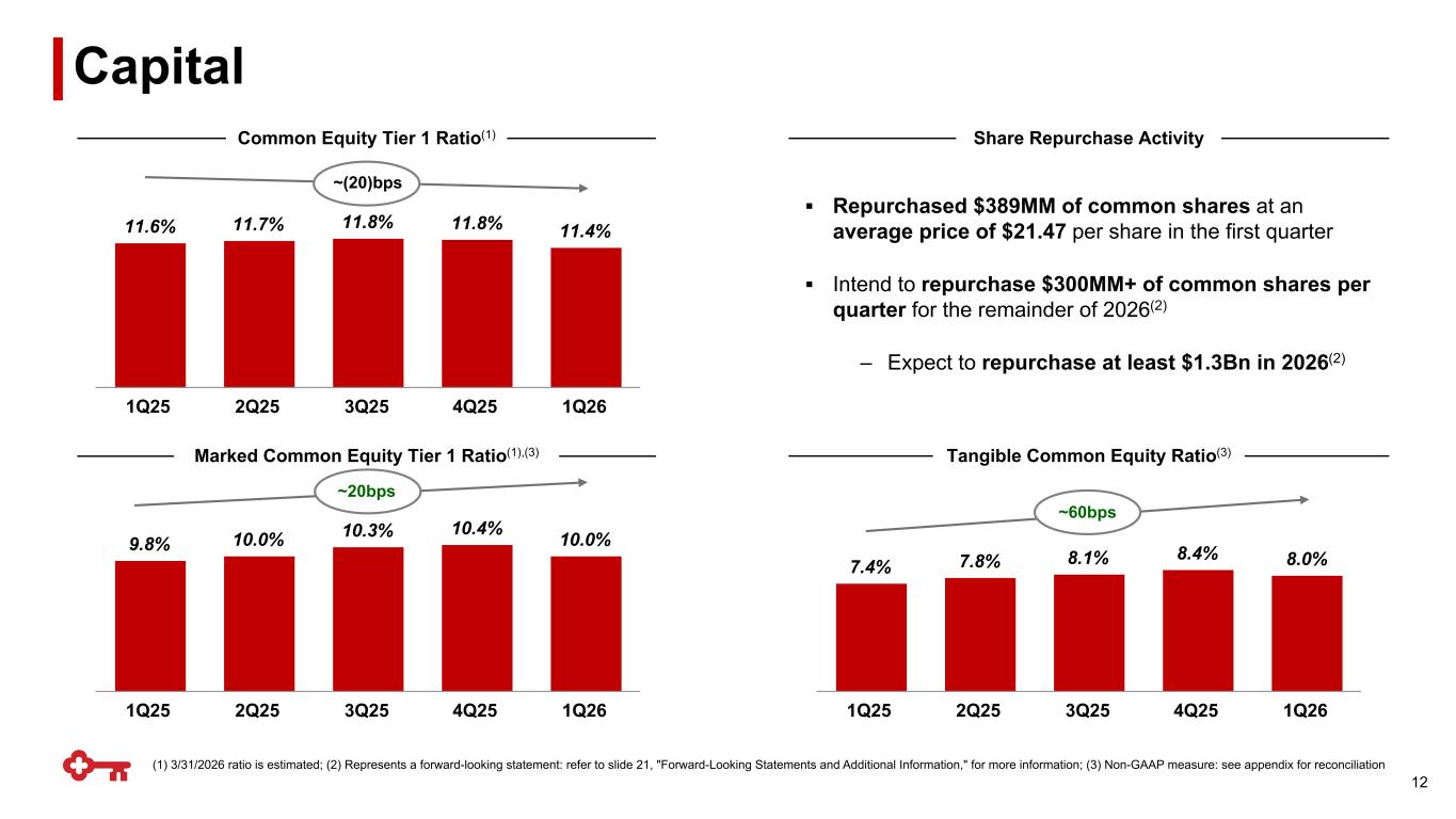 0.27% 0.25% 0.24% 0.21% 0.13% 0.08% 0.07% 0.10% 0.09% 0.14% 30-89 days delinquent 90+ days delinquent 1Q25 2Q25 3Q25 4Q25 1Q26 $6,265 $6,062 $5,871 $5,373 $5,370 6.0% 5.7% 5.5% 5.0% 4.9% Criticized outstandings Criticized outstandings to period-end total loans 1Q25 2Q25 3Q25 4Q25 1Q26 $700 $707 $668 $627 $692 0.67% 0.66% 0.63% 0.59% 0.63% NPAs NPA ratio 1Q25 2Q25 3Q25 4Q25 1Q26 (1) Nonperforming assets to period-end portfolio loans plus OREO and other nonperforming assets; (2) Loan and lease outstandings $ in millions Net Charge-Offs (NCOs) & Provision for Credit Losses Delinquencies to Period-End Total Loans Criticized Outstandings(2) to Period-End Total Loans $ in millions; from continuing operations Nonperforming Assets (NPAs) Ratio(1) $ in millions Credit Quality From continuing operations 11 $110 $102 $114 $104 $101$118 $138 $107 $108 $106 0.43% 0.39% 0.42% 0.39% 0.38% NCOs Provision for credit losses NCOs to average loans 1Q25 2Q25 3Q25 4Q25 1Q26 (1)