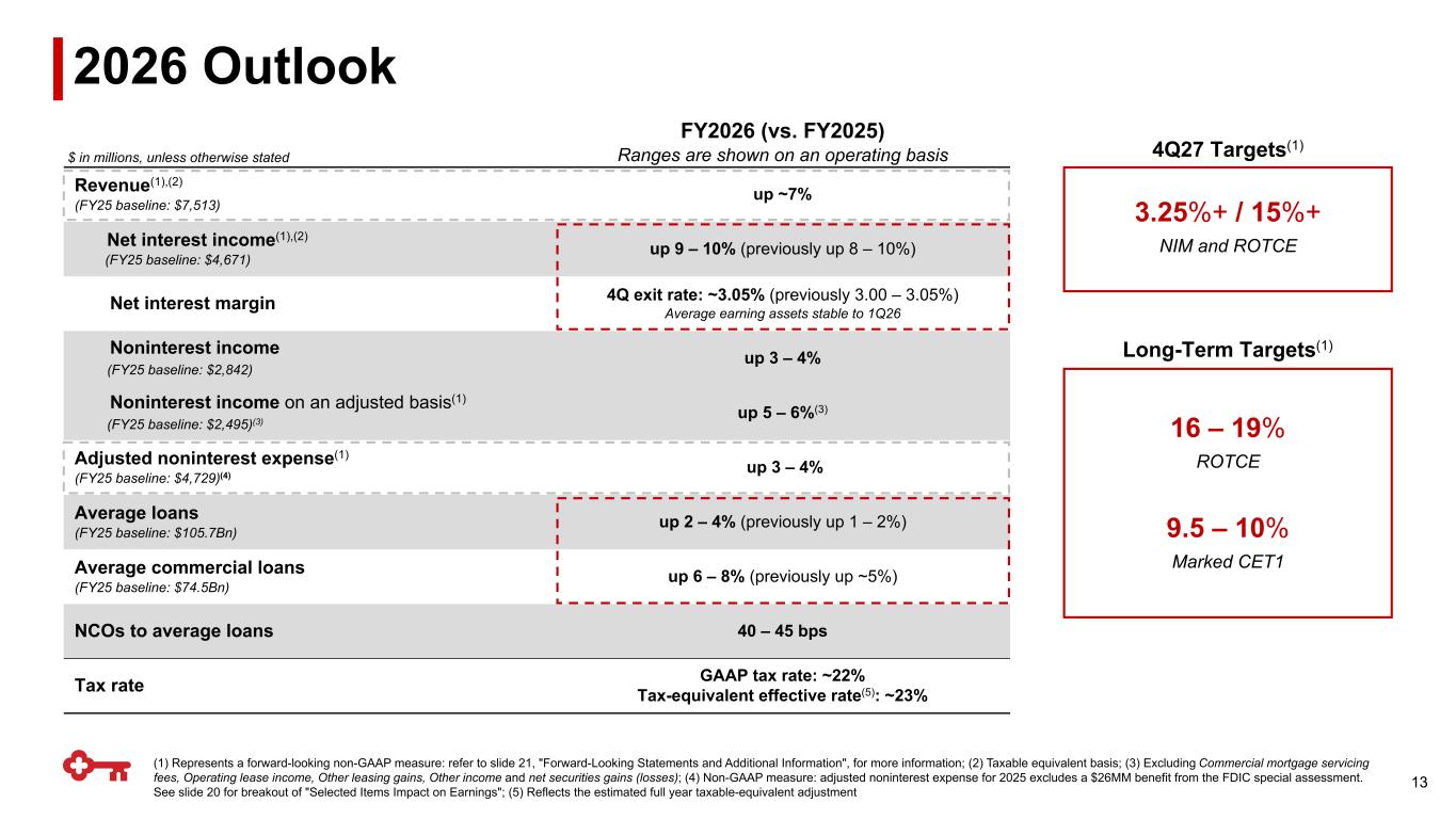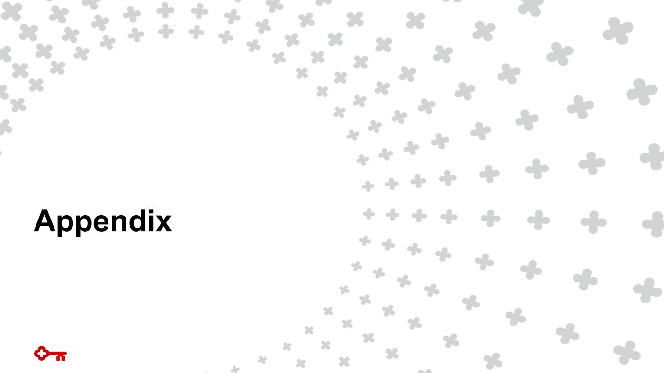 This communication contains forward-looking statements within the meaning of the Private Securities Litigation Reform Act of 1995 including, but not limited to, KeyCorp’s expectations or predictions of future financial or business performance or conditions. Forward-looking statements are typically identified by words such as “believe,” “seek,” “expect,” “anticipate,” “intend,” “target,” “estimate,” “continue,” “positions,” “plan,” “predict,” “project,” “forecast,” “guidance,” “goal,” “objective,” “prospects,” “possible,” “potential,” “strategy,” “opportunities,” or “trends,” by future conditional verbs such as “assume,” “will,” “would,” “should,” “could” or “may”, or by variations of such words or by similar expressions. These forward-looking statements are based on assumptions that involve risks and uncertainties, which are subject to change based on various important factors (some of which are beyond KeyCorp’s control). Actual results may differ materially from current projections. Actual outcomes may differ materially from those expressed or implied as a result of the factors described under “Forward-looking Statements” and “Risk Factors” in KeyCorp’s Annual Report on Form 10-K for the year ended December 31, 2025, and in subsequent filings of KeyCorp with the Securities and Exchange Commission (the “SEC”). Such forward-looking statements speak only as of the date they are made, and we undertake no obligation to update any forward-looking statement to reflect events or circumstances after that date or to reflect the occurrence of unanticipated events. For additional information regarding KeyCorp, please refer to our SEC filings available at www.key.com/ir. Non-GAAP Measures. This document contains GAAP financial measures and non-GAAP financial measures where management believes it to be helpful in understanding Key’s results of operations or financial position. Where non-GAAP financial measures are used, the comparable GAAP financial measure, as well as the reconciliation to the comparable GAAP financial measure, can be found in the appendix to this presentation, the financial supplement, or the press release related to this presentation, all of which can be found on Key’s website (www.key.com/ir). Forward-Looking Non-GAAP Measures. From time to time we may discuss forward-looking non-GAAP financial measures. We are unable to provide a reconciliation of forward-looking non-GAAP financial measures to their most directly comparable GAAP financial measures because we are unable to provide, without unreasonable effort, a meaningful or accurate calculation or estimation of amounts that would be necessary for the reconciliation due to the complexity and inherent difficulty in forecasting and quantifying future amounts or when they may occur. Such unavailable information could be significant for future results. Annualized Data. Certain returns, yields, performance ratios, or quarterly growth rates are presented on an “annualized” basis. This is done for analytical and decision-making purposes to better discern underlying performance trends when compared to full-year or year-over-year amounts. Taxable Equivalent. Income from tax-exempt earning assets is increased by an amount equivalent to the taxes that would have been paid if this income had been taxable at the federal statutory rate. This adjustment puts all earning assets, most notably tax-exempt municipal securities, and certain lease assets, on a common basis that facilitates comparison of results to results of peers. Earnings Per Share Equivalent. Certain income or expense items may be expressed on a per common share basis. This is done for analytical and decision-making purposes to better discern underlying trends in total consolidated earnings per share performance excluding the impact of such items. When the impact of certain income or expense items is disclosed separately, the after-tax amount is computed using the marginal tax rate, unless otherwise specified, with this then being the amount used to calculate the earnings per share equivalent. GAAP: Generally Accepted Accounting Principles Forward-looking Statements and Additional Information 21