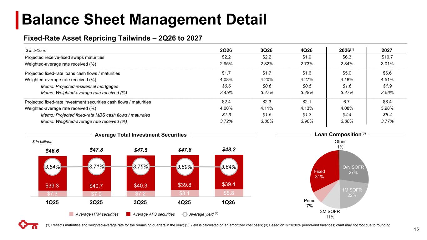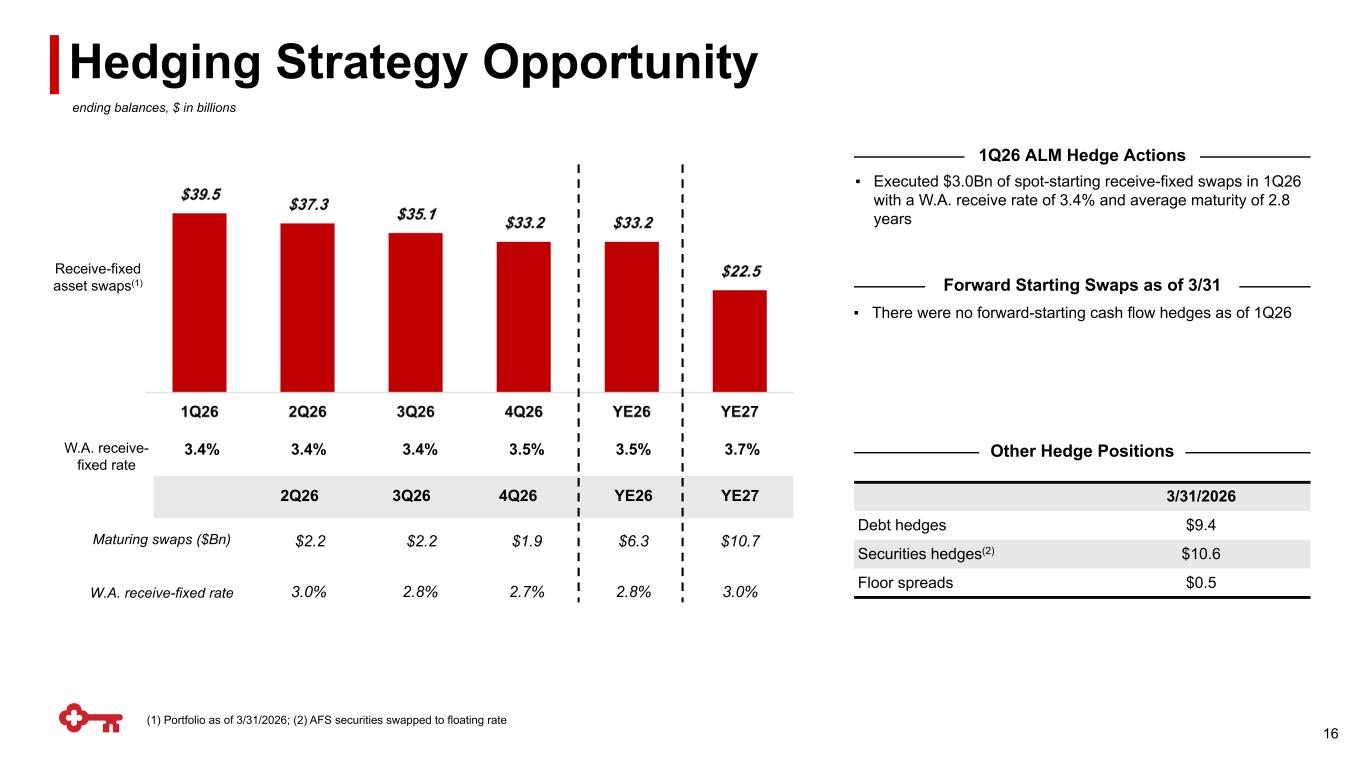 (1) Reflects maturities and weighted-average rate for the remaining quarters in the year; (2) Yield is calculated on an amortized cost basis; (3) Based on 3/31/2026 period-end balances; chart may not foot due to rounding Loan Composition(3) $ in billions Average Total Investment Securities Fixed-Rate Asset Repricing Tailwinds – 2Q26 to 2027 Balance Sheet Management Detail 15 $46.6 $47.8 $47.5 $47.8 $48.2 $7.3 $7.0 $7.2 $8.1 $8.8 $39.3 $40.7 $40.3 $39.8 $39.4 3.64% 3.71% 3.75% 3.69% 3.64% Average HTM securities Average AFS securities Average yield 1Q25 2Q25 3Q25 4Q25 1Q26 3M SOFR 11% Other 1% (2) $ in billions 2Q26 3Q26 4Q26 2026(1) 2027 Projected receive-fixed swaps maturities $2.2 $2.2 $1.9 $6.3 $10.7 Weighted-average rate received (%) 2.95% 2.82% 2.73% 2.84% 3.01% Projected fixed-rate loans cash flows / maturities $1.7 $1.7 $1.6 $5.0 $6.6 Weighted-average rate received (%) 4.08% 4.20% 4.27% 4.18% 4.51% Memo: Projected residential mortgages $0.6 $0.6 $0.5 $1.6 $1.9 Memo: Weighted-average rate received (%) 3.45% 3.47% 3.48% 3.47% 3.56% Projected fixed-rate investment securities cash flows / maturities $2.4 $2.3 $2.1 6.7 $8.4 Weighted-average rate received (%) 4.00% 4.11% 4.13% 4.08% 3.98% Memo: Projected fixed-rate MBS cash flows / maturities $1.6 $1.5 $1.3 $4.4 $5.4 Memo: Weighted-average rate received (%) 3.72% 3.80% 3.90% 3.80% 3.77% 1M SOFR 22% O/N SOFR 27%Fixed 31% Prime 7%