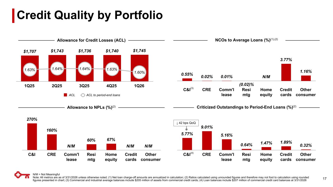 Hedging Strategy Opportunity 16 ending balances, $ in billions 3.4% 3.4% 3.4% 3.5% 3.5% 3.7% 2Q26 3Q26 4Q26 YE26 YE27 $2.2 $2.2 $1.9 $6.3 $10.7 3.0% 2.8% 2.7% 2.8% 3.0% W.A. receive- fixed rate Maturing swaps ($Bn) W.A. receive-fixed rate Receive-fixed asset swaps(1) (1) Portfolio as of 3/31/2026; (2) AFS securities swapped to floating rate 3/31/2026 Debt hedges $9.4 Securities hedges(2) $10.6 Floor spreads $0.5 Other Hedge Positions ▪ Executed $3.0Bn of spot-starting receive-fixed swaps in 1Q26 with a W.A. receive rate of 3.4% and average maturity of 2.8 years 1Q26 ALM Hedge Actions ▪ There were no forward-starting cash flow hedges as of 1Q26 Forward Starting Swaps as of 3/31