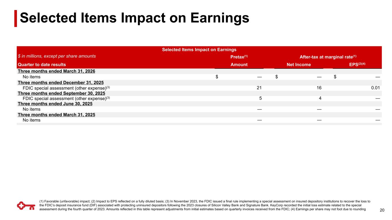 (1) Favorable (unfavorable) impact; (2) Impact to EPS reflected on a fully diluted basis; (3) In November 2023, the FDIC issued a final rule implementing a special assessment on insured depository institutions to recover the loss to the FDIC’s deposit insurance fund (DIF) associated with protecting uninsured depositors following the 2023 closures of Silicon Valley Bank and Signature Bank. KeyCorp recorded the initial loss estimate related to the special assessment during the fourth quarter of 2023. Amounts reflected in this table represent adjustments from initial estimates based on quarterly invoices received from the FDIC; (4) Earnings per share may not foot due to rounding Selected Items Impact on Earnings $ in millions, except per share amounts Pretax(1) After-tax at marginal rate(1) Quarter to date results Amount Net Income EPS(2)(4) Three months ended March 31, 2026 No items $ — $ — $ — Three months ended December 31, 2025 FDIC special assessment (other expense)(3) 21 16 0.01 Three months ended September 30, 2025 FDIC special assessment (other expense)(3) 5 4 — Three months ended June 30, 2025 No items — — — Three months ended March 31, 2025 No items — — — 20 Selected Items Impact on Earnings