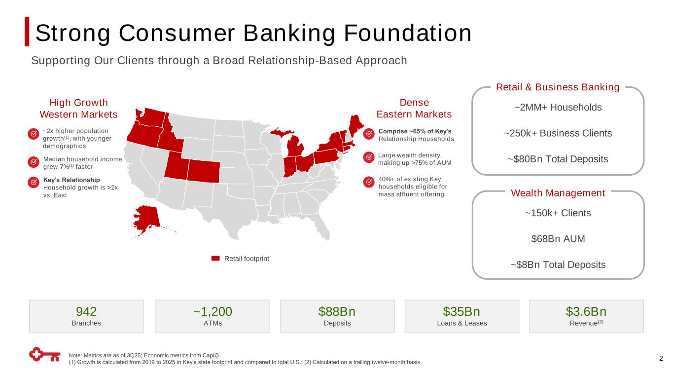 Strong Consumer Banking Foundation 2 Retail footprint ~2MM+ Households ~250k+ Business Clients ~$80Bn Total Deposits Retail & Business Banking ~150k+ Clients $68Bn AUM ~$8Bn Total Deposits Wealth Management Dense Eastern Markets High Growth Western Markets ~2x higher population growth(1), with younger demographics Median household income grew 7%(1) faster Large wealth density, making up >75% of AUM Note: Metrics are as of 3Q25; Economic metrics from CapIQ (1) Growth is calculated from 2019 to 2025 in Key’s state footprint and compared to total U.S.; (2) Calculated on a trailing twelve-month basis $3.6Bn Revenue(2) $35Bn Loans & Leases $88Bn Deposits 942 Branches ~1,200 ATMs Supporting Our Clients through a Broad Relationship-Based Approach 40%+ of existing Key households eligible for mass affluent offering Key’s Relationship Household growth is >2x vs. East Comprise ~65% of Key’s Relationship Households
