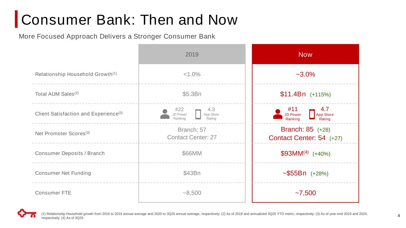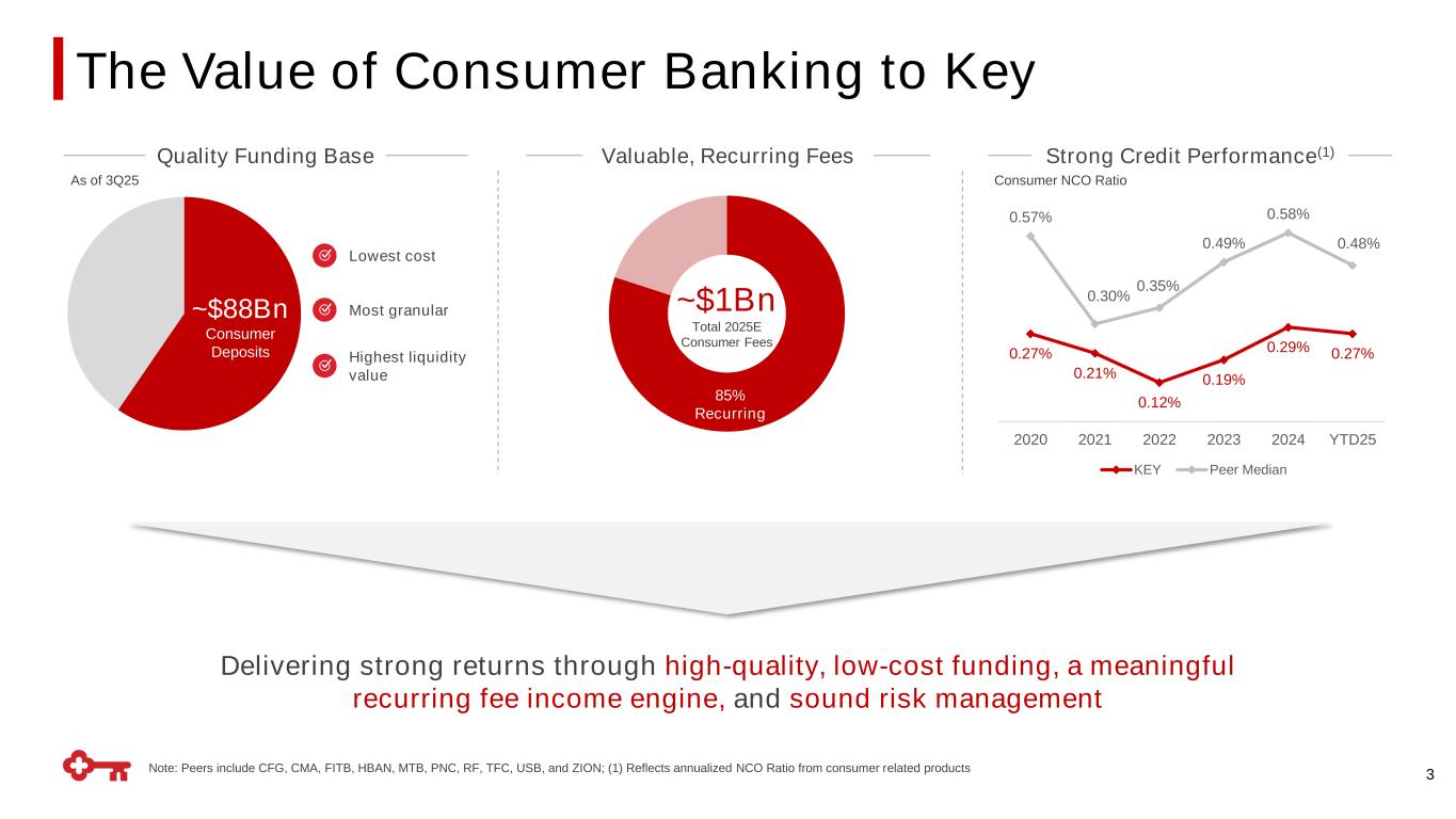 ~$88Bn Consumer Deposits The Value of Consumer Banking to Key 3 0.27% 0.21% 0.12% 0.19% 0.29% 0.27% 0.57% 0.30% 0.35% 0.49% 0.58% 0.48% 2020 2021 2022 2023 2024 YTD25 KEY Peer Median ~$1Bn Total 2025E Consumer Fees 85% Recurring Lowest cost Strong Credit Performance(1) Consumer NCO Ratio Valuable, Recurring Fees As of 3Q25 Delivering strong returns through high-quality, low-cost funding, a meaningful recurring fee income engine, and sound risk management Quality Funding Base Most granular Highest liquidity value Note: Peers include CFG, CMA, FITB, HBAN, MTB, PNC, RF, TFC, USB, and ZION; (1) Reflects annualized NCO Ratio from consumer related products