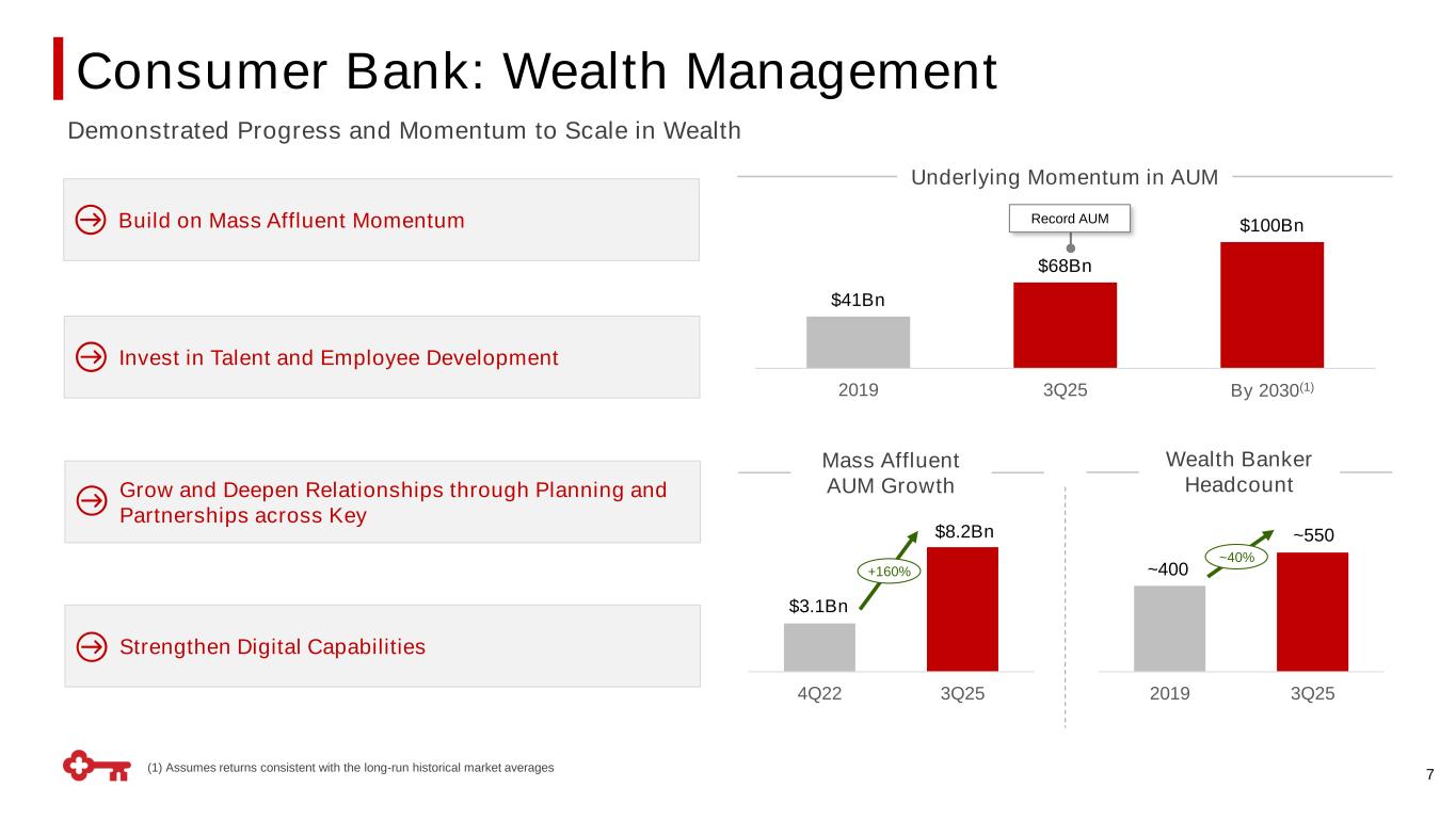 Consumer Bank: Wealth Management 6 3Q25 TTM(1) Noninterest Income Contribution Wealth Management Client Continuum Competitively Positioned Business Serving across the Wealth Continuum 21% 27% 12% 10% 10% 10% 9% IBDP Cards & Payments Service Charges on Deposit Accounts Corporate Services Commercial Mortgage Servicing Other Trust & Investment Services(2) $88MM $72MM $70MM $47MM $33MM $8MM Peer 1 Peer 2 Peer 3 Peer 4 Peer 5 As of 3Q25 AUM per Branch vs. Similarly Sized Peers(3) Note: IBDP represents Investment Banking and Debt Placement; Peers include CFG, FITB, HBAN, MTB, and RF; (1) Reflects comparison of adjusted noninterest income metrics. See page 25 of KeyCorp’s 3Q25 earnings release for a breakout of Selected Items Impact on Earnings; (2) Includes ~$102MM of Commercial Brokerage; (3) Due to limited disclosures, certain data is sourced from the September 30, 2025 call report Serving Mass Affluent Population Serving HNW, UHNW, & Institutional Clients $2MM+$250K – $2MM Key Private Client Key Private Bank