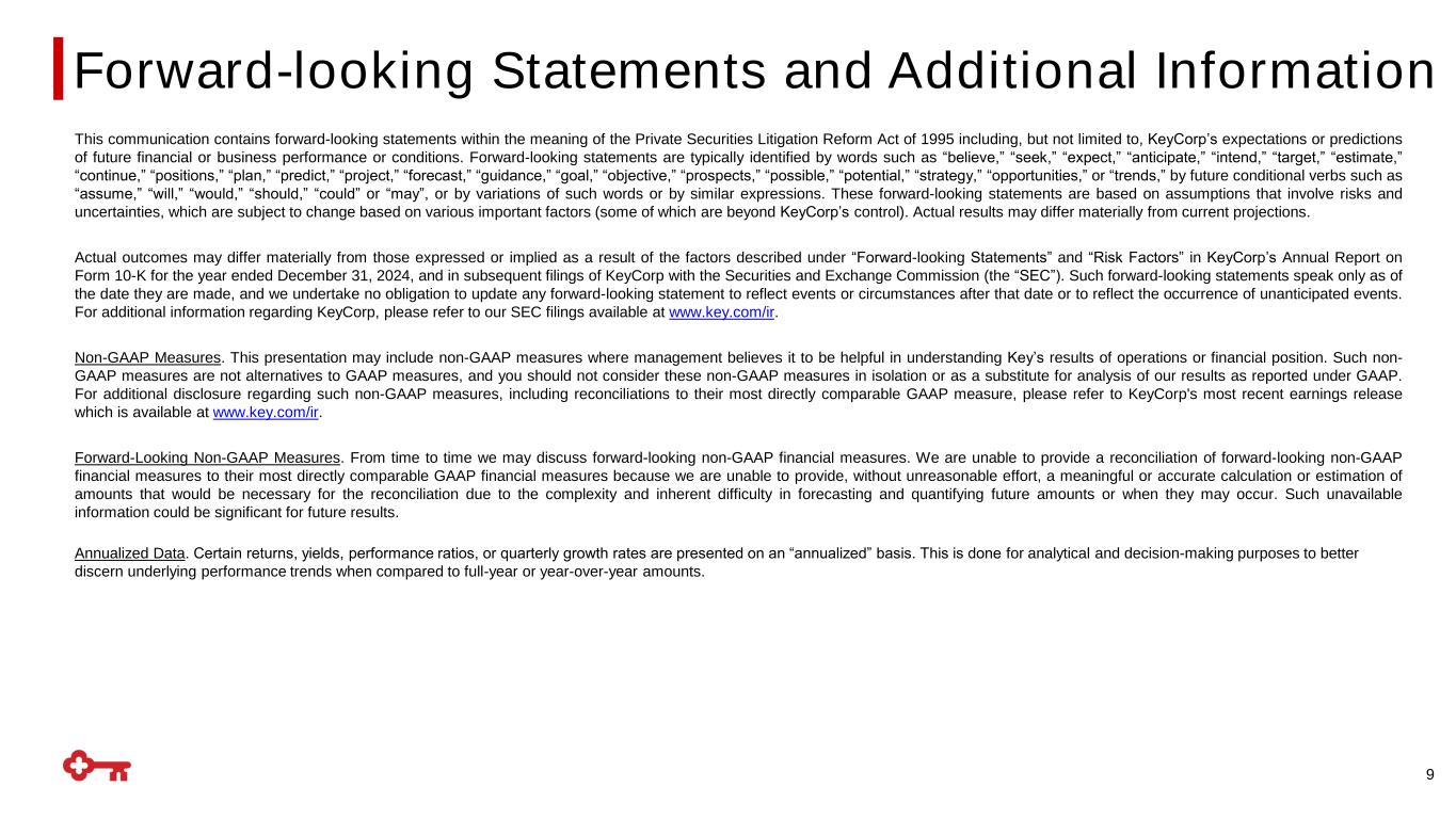 Forward-looking Statements and Additional Information 9 This communication contains forward-looking statements within the meaning of the Private Securities Litigation Reform Act of 1995 including, but not limited to, KeyCorp’s expectations or predictions of future financial or business performance or conditions. Forward-looking statements are typically identified by words such as “believe,” “seek,” “expect,” “anticipate,” “intend,” “target,” “estimate,” “continue,” “positions,” “plan,” “predict,” “project,” “forecast,” “guidance,” “goal,” “objective,” “prospects,” “possible,” “potential,” “strategy,” “opportunities,” or “trends,” by future conditional verbs such as “assume,” “will,” “would,” “should,” “could” or “may”, or by variations of such words or by similar expressions. These forward-looking statements are based on assumptions that involve risks and uncertainties, which are subject to change based on various important factors (some of which are beyond KeyCorp’s control). Actual results may differ materially from current projections. Actual outcomes may differ materially from those expressed or implied as a result of the factors described under “Forward-looking Statements” and “Risk Factors” in KeyCorp’s Annual Report on Form 10-K for the year ended December 31, 2024, and in subsequent filings of KeyCorp with the Securities and Exchange Commission (the “SEC”). Such forward-looking statements speak only as of the date they are made, and we undertake no obligation to update any forward-looking statement to reflect events or circumstances after that date or to reflect the occurrence of unanticipated events. For additional information regarding KeyCorp, please refer to our SEC filings available at www.key.com/ir. Non-GAAP Measures. This presentation may include non-GAAP measures where management believes it to be helpful in understanding Key’s results of operations or financial position. Such non- GAAP measures are not alternatives to GAAP measures, and you should not consider these non-GAAP measures in isolation or as a substitute for analysis of our results as reported under GAAP. For additional disclosure regarding such non-GAAP measures, including reconciliations to their most directly comparable GAAP measure, please refer to KeyCorp's most recent earnings release which is available at www.key.com/ir. Forward-Looking Non-GAAP Measures. From time to time we may discuss forward-looking non-GAAP financial measures. We are unable to provide a reconciliation of forward-looking non-GAAP financial measures to their most directly comparable GAAP financial measures because we are unable to provide, without unreasonable effort, a meaningful or accurate calculation or estimation of amounts that would be necessary for the reconciliation due to the complexity and inherent difficulty in forecasting and quantifying future amounts or when they may occur. Such unavailable information could be significant for future results. Annualized Data. Certain returns, yields, performance ratios, or quarterly growth rates are presented on an “annualized” basis. This is done for analytical and decision-making purposes to better discern underlying performance trends when compared to full-year or year-over-year amounts.