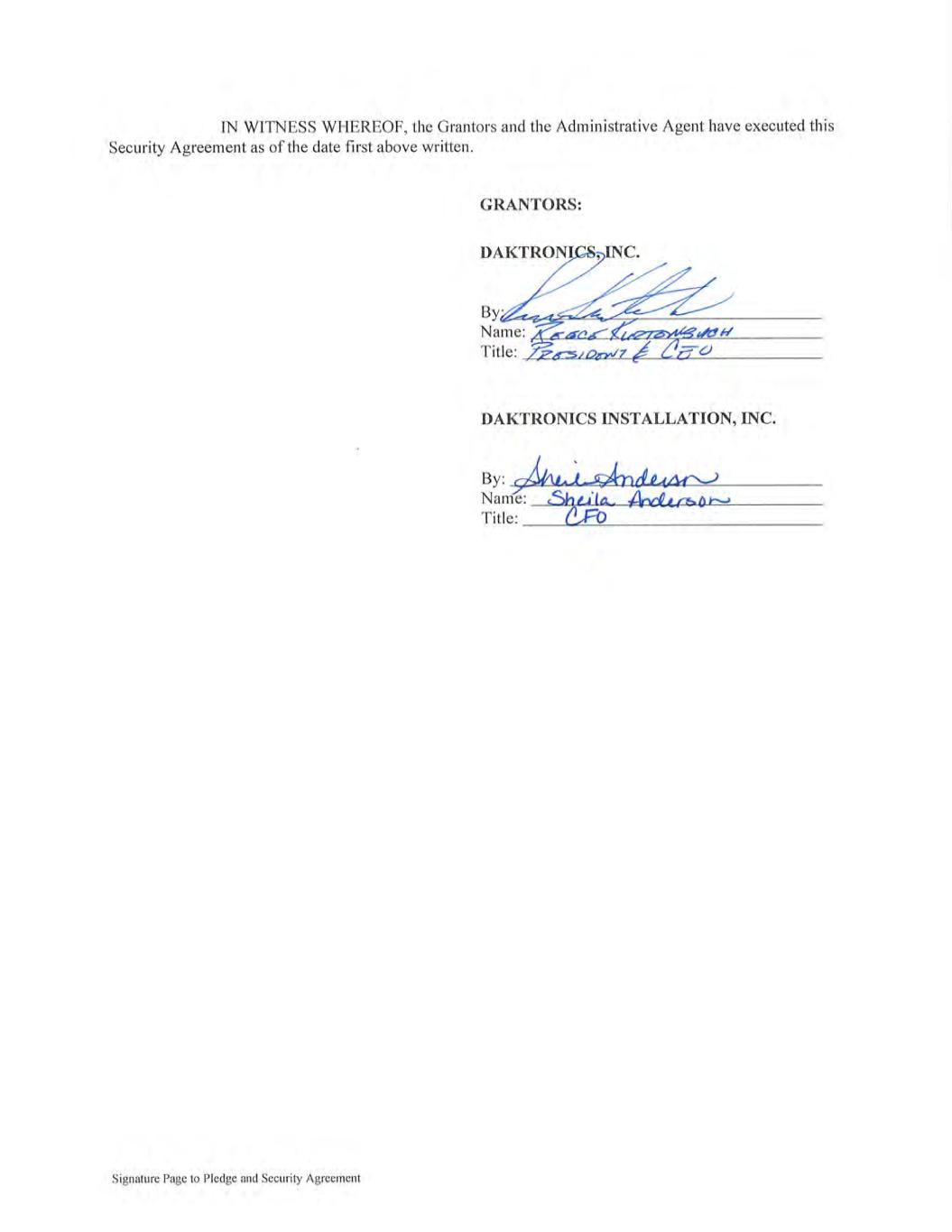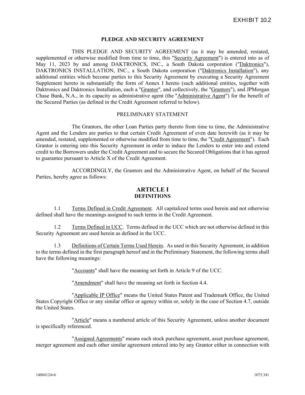 14084124v6 1075.341 PLEDGE AND SECURITY AGREEMENT THIS PLEDGE AND SECURITY AGREEMENT (as it may be amended, restated, supplemented or otherwise modified from time to time, this "Security Agreement") is entered into as of May 11, 2023 by and among DAKTRONICS, INC., a South Dakota corporation ("Daktronics"), DAKTRONICS INSTALLATION, INC., a South Dakota corporation ("Daktronics Installation"), any additional entities which become parties to this Security Agreement by executing a Security Agreement Supplement hereto in substantially the form of Annex I hereto (such additional entities, together with Daktronics and Daktronics Installation, each a "Grantor", and collectively, the "Grantors"), and JPMorgan Chase Bank, N.A., in its capacity as administrative agent (the "Administrative Agent") for the benefit of the Secured Parties (as defined in the Credit Agreement referred to below). PRELIMINARY STATEMENT The Grantors, the other Loan Parties party thereto from time to time, the Administrative Agent and the Lenders are parties to that certain Credit Agreement of even date herewith (as it may be amended, restated, supplemented or otherwise modified from time to time, the "Credit Agreement"). Each Grantor is entering into this Security Agreement in order to induce the Lenders to enter into and extend credit to the Borrowers under the Credit Agreement and to secure the Secured Obligations that it has agreed to guarantee pursuant to Article X of the Credit Agreement. ACCORDINGLY, the Grantors and the Administrative Agent, on behalf of the Secured Parties, hereby agree as follows: ARTICLE I DEFINITIONS 1.1 Terms Defined in Credit Agreement. All capitalized terms used herein and not otherwise defined shall have the meanings assigned to such terms in the Credit Agreement. 1.2 Terms Defined in UCC. Terms defined in the UCC which are not otherwise defined in this Security Agreement are used herein as defined in the UCC. 1.3 Definitions of Certain Terms Used Herein. As used in this Security Agreement, in addition to the terms defined in the first paragraph hereof and in the Preliminary Statement, the following terms shall have the following meanings: "Accounts" shall have the meaning set forth in Article 9 of the UCC. "Amendment" shall have the meaning set forth in Section 4.4. "Applicable IP Office" means the United States Patent and Trademark Office, the United States Copyright Office or any similar office or agency within or, solely in the case of Section 4.7, outside the United States. "Article" means a numbered article of this Security Agreement, unless another document is specifically referenced. "Assigned Agreements" means each stock purchase agreement, asset purchase agreement, merger agreement and each other similar agreement entered into by any Grantor either in connection with EXHIBIT 10.2
