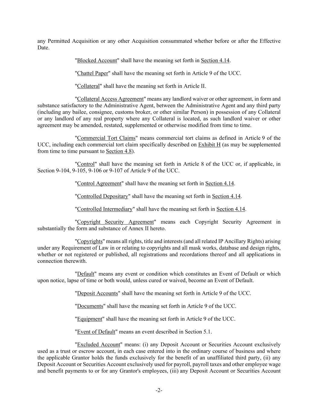 -2- any Permitted Acquisition or any other Acquisition consummated whether before or after the Effective Date. "Blocked Account" shall have the meaning set forth in Section 4.14. "Chattel Paper" shall have the meaning set forth in Article 9 of the UCC. "Collateral" shall have the meaning set forth in Article II. "Collateral Access Agreement" means any landlord waiver or other agreement, in form and substance satisfactory to the Administrative Agent, between the Administrative Agent and any third party (including any bailee, consignee, customs broker, or other similar Person) in possession of any Collateral or any landlord of any real property where any Collateral is located, as such landlord waiver or other agreement may be amended, restated, supplemented or otherwise modified from time to time. "Commercial Tort Claims" means commercial tort claims as defined in Article 9 of the UCC, including each commercial tort claim specifically described on Exhibit H (as may be supplemented from time to time pursuant to Section 4.8). "Control" shall have the meaning set forth in Article 8 of the UCC or, if applicable, in Section 9-104, 9-105, 9-106 or 9-107 of Article 9 of the UCC. "Control Agreement" shall have the meaning set forth in Section 4.14. "Controlled Depositary" shall have the meaning set forth in Section 4.14. "Controlled Intermediary" shall have the meaning set forth in Section 4.14. "Copyright Security Agreement" means each Copyright Security Agreement in substantially the form and substance of Annex II hereto. "Copyrights" means all rights, title and interests (and all related IP Ancillary Rights) arising under any Requirement of Law in or relating to copyrights and all mask works, database and design rights, whether or not registered or published, all registrations and recordations thereof and all applications in connection therewith. "Default" means any event or condition which constitutes an Event of Default or which upon notice, lapse of time or both would, unless cured or waived, become an Event of Default. "Deposit Accounts" shall have the meaning set forth in Article 9 of the UCC. "Documents" shall have the meaning set forth in Article 9 of the UCC. "Equipment" shall have the meaning set forth in Article 9 of the UCC. "Event of Default" means an event described in Section 5.1. "Excluded Account" means: (i) any Deposit Account or Securities Account exclusively used as a trust or escrow account, in each case entered into in the ordinary course of business and where the applicable Grantor holds the funds exclusively for the benefit of an unaffiliated third party, (ii) any Deposit Account or Securities Account exclusively used for payroll, payroll taxes and other employee wage and benefit payments to or for any Grantor's employees, (iii) any Deposit Account or Securities Account