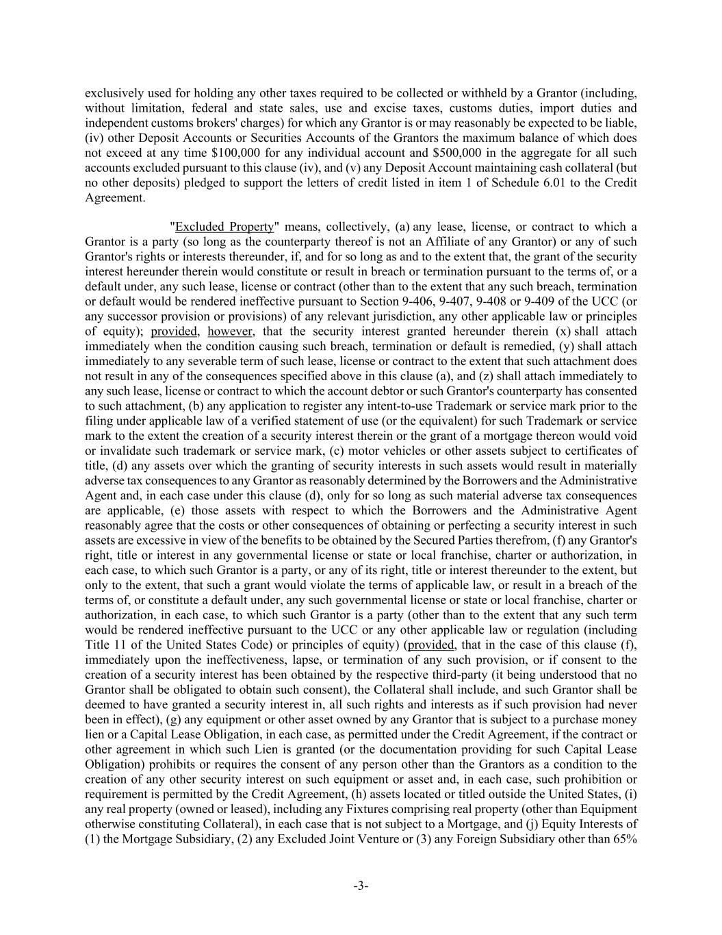 -3- exclusively used for holding any other taxes required to be collected or withheld by a Grantor (including, without limitation, federal and state sales, use and excise taxes, customs duties, import duties and independent customs brokers' charges) for which any Grantor is or may reasonably be expected to be liable, (iv) other Deposit Accounts or Securities Accounts of the Grantors the maximum balance of which does not exceed at any time $100,000 for any individual account and $500,000 in the aggregate for all such accounts excluded pursuant to this clause (iv), and (v) any Deposit Account maintaining cash collateral (but no other deposits) pledged to support the letters of credit listed in item 1 of Schedule 6.01 to the Credit Agreement. "Excluded Property" means, collectively, (a) any lease, license, or contract to which a Grantor is a party (so long as the counterparty thereof is not an Affiliate of any Grantor) or any of such Grantor's rights or interests thereunder, if, and for so long as and to the extent that, the grant of the security interest hereunder therein would constitute or result in breach or termination pursuant to the terms of, or a default under, any such lease, license or contract (other than to the extent that any such breach, termination or default would be rendered ineffective pursuant to Section 9-406, 9-407, 9-408 or 9-409 of the UCC (or any successor provision or provisions) of any relevant jurisdiction, any other applicable law or principles of equity); provided, however, that the security interest granted hereunder therein (x) shall attach immediately when the condition causing such breach, termination or default is remedied, (y) shall attach immediately to any severable term of such lease, license or contract to the extent that such attachment does not result in any of the consequences specified above in this clause (a), and (z) shall attach immediately to any such lease, license or contract to which the account debtor or such Grantor's counterparty has consented to such attachment, (b) any application to register any intent-to-use Trademark or service mark prior to the filing under applicable law of a verified statement of use (or the equivalent) for such Trademark or service mark to the extent the creation of a security interest therein or the grant of a mortgage thereon would void or invalidate such trademark or service mark, (c) motor vehicles or other assets subject to certificates of title, (d) any assets over which the granting of security interests in such assets would result in materially adverse tax consequences to any Grantor as reasonably determined by the Borrowers and the Administrative Agent and, in each case under this clause (d), only for so long as such material adverse tax consequences are applicable, (e) those assets with respect to which the Borrowers and the Administrative Agent reasonably agree that the costs or other consequences of obtaining or perfecting a security interest in such assets are excessive in view of the benefits to be obtained by the Secured Parties therefrom, (f) any Grantor's right, title or interest in any governmental license or state or local franchise, charter or authorization, in each case, to which such Grantor is a party, or any of its right, title or interest thereunder to the extent, but only to the extent, that such a grant would violate the terms of applicable law, or result in a breach of the terms of, or constitute a default under, any such governmental license or state or local franchise, charter or authorization, in each case, to which such Grantor is a party (other than to the extent that any such term would be rendered ineffective pursuant to the UCC or any other applicable law or regulation (including Title 11 of the United States Code) or principles of equity) (provided, that in the case of this clause (f), immediately upon the ineffectiveness, lapse, or termination of any such provision, or if consent to the creation of a security interest has been obtained by the respective third-party (it being understood that no Grantor shall be obligated to obtain such consent), the Collateral shall include, and such Grantor shall be deemed to have granted a security interest in, all such rights and interests as if such provision had never been in effect), (g) any equipment or other asset owned by any Grantor that is subject to a purchase money lien or a Capital Lease Obligation, in each case, as permitted under the Credit Agreement, if the contract or other agreement in which such Lien is granted (or the documentation providing for such Capital Lease Obligation) prohibits or requires the consent of any person other than the Grantors as a condition to the creation of any other security interest on such equipment or asset and, in each case, such prohibition or requirement is permitted by the Credit Agreement, (h) assets located or titled outside the United States, (i) any real property (owned or leased), including any Fixtures comprising real property (other than Equipment otherwise constituting Collateral), in each case that is not subject to a Mortgage, and (j) Equity Interests of (1) the Mortgage Subsidiary, (2) any Excluded Joint Venture or (3) any Foreign Subsidiary other than 65%