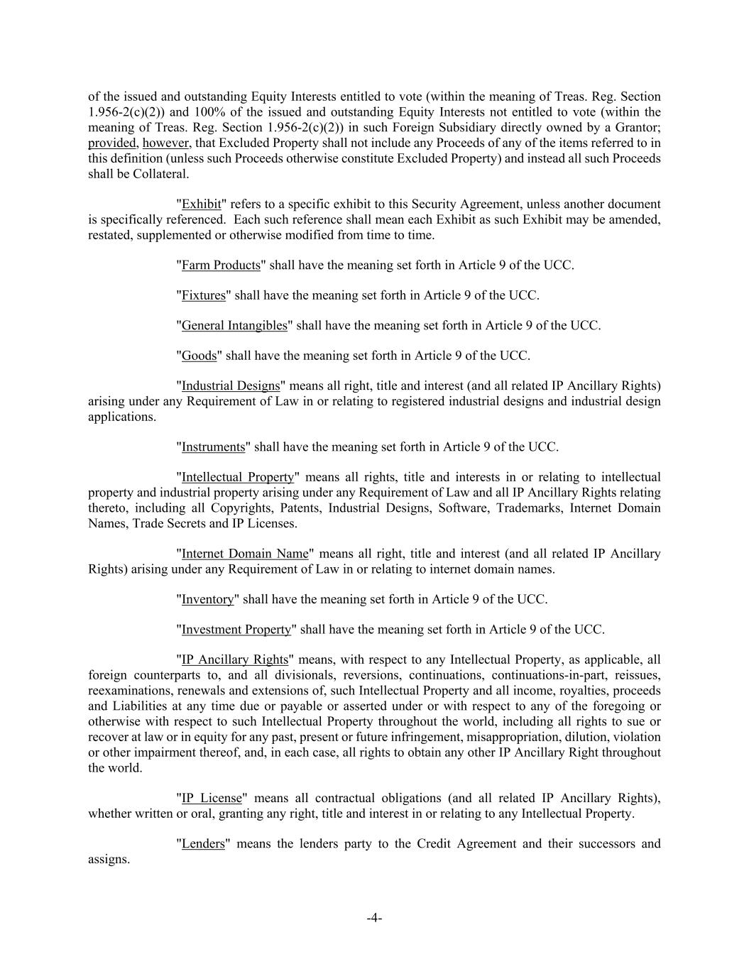 -4- of the issued and outstanding Equity Interests entitled to vote (within the meaning of Treas. Reg. Section 1.956-2(c)(2)) and 100% of the issued and outstanding Equity Interests not entitled to vote (within the meaning of Treas. Reg. Section 1.956-2(c)(2)) in such Foreign Subsidiary directly owned by a Grantor; provided, however, that Excluded Property shall not include any Proceeds of any of the items referred to in this definition (unless such Proceeds otherwise constitute Excluded Property) and instead all such Proceeds shall be Collateral. "Exhibit" refers to a specific exhibit to this Security Agreement, unless another document is specifically referenced. Each such reference shall mean each Exhibit as such Exhibit may be amended, restated, supplemented or otherwise modified from time to time. "Farm Products" shall have the meaning set forth in Article 9 of the UCC. "Fixtures" shall have the meaning set forth in Article 9 of the UCC. "General Intangibles" shall have the meaning set forth in Article 9 of the UCC. "Goods" shall have the meaning set forth in Article 9 of the UCC. "Industrial Designs" means all right, title and interest (and all related IP Ancillary Rights) arising under any Requirement of Law in or relating to registered industrial designs and industrial design applications. "Instruments" shall have the meaning set forth in Article 9 of the UCC. "Intellectual Property" means all rights, title and interests in or relating to intellectual property and industrial property arising under any Requirement of Law and all IP Ancillary Rights relating thereto, including all Copyrights, Patents, Industrial Designs, Software, Trademarks, Internet Domain Names, Trade Secrets and IP Licenses. "Internet Domain Name" means all right, title and interest (and all related IP Ancillary Rights) arising under any Requirement of Law in or relating to internet domain names. "Inventory" shall have the meaning set forth in Article 9 of the UCC. "Investment Property" shall have the meaning set forth in Article 9 of the UCC. "IP Ancillary Rights" means, with respect to any Intellectual Property, as applicable, all foreign counterparts to, and all divisionals, reversions, continuations, continuations-in-part, reissues, reexaminations, renewals and extensions of, such Intellectual Property and all income, royalties, proceeds and Liabilities at any time due or payable or asserted under or with respect to any of the foregoing or otherwise with respect to such Intellectual Property throughout the world, including all rights to sue or recover at law or in equity for any past, present or future infringement, misappropriation, dilution, violation or other impairment thereof, and, in each case, all rights to obtain any other IP Ancillary Right throughout the world. "IP License" means all contractual obligations (and all related IP Ancillary Rights), whether written or oral, granting any right, title and interest in or relating to any Intellectual Property. "Lenders" means the lenders party to the Credit Agreement and their successors and assigns.