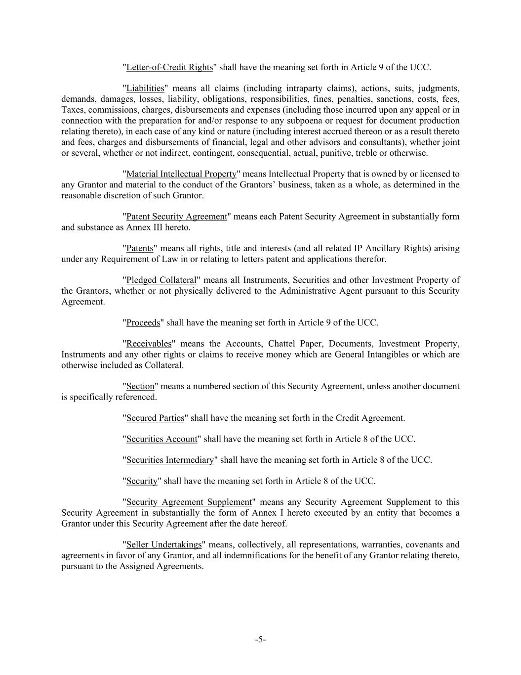 -5- "Letter-of-Credit Rights" shall have the meaning set forth in Article 9 of the UCC. "Liabilities" means all claims (including intraparty claims), actions, suits, judgments, demands, damages, losses, liability, obligations, responsibilities, fines, penalties, sanctions, costs, fees, Taxes, commissions, charges, disbursements and expenses (including those incurred upon any appeal or in connection with the preparation for and/or response to any subpoena or request for document production relating thereto), in each case of any kind or nature (including interest accrued thereon or as a result thereto and fees, charges and disbursements of financial, legal and other advisors and consultants), whether joint or several, whether or not indirect, contingent, consequential, actual, punitive, treble or otherwise. "Material Intellectual Property" means Intellectual Property that is owned by or licensed to any Grantor and material to the conduct of the Grantors’ business, taken as a whole, as determined in the reasonable discretion of such Grantor. "Patent Security Agreement" means each Patent Security Agreement in substantially form and substance as Annex III hereto. "Patents" means all rights, title and interests (and all related IP Ancillary Rights) arising under any Requirement of Law in or relating to letters patent and applications therefor. "Pledged Collateral" means all Instruments, Securities and other Investment Property of the Grantors, whether or not physically delivered to the Administrative Agent pursuant to this Security Agreement. "Proceeds" shall have the meaning set forth in Article 9 of the UCC. "Receivables" means the Accounts, Chattel Paper, Documents, Investment Property, Instruments and any other rights or claims to receive money which are General Intangibles or which are otherwise included as Collateral. "Section" means a numbered section of this Security Agreement, unless another document is specifically referenced. "Secured Parties" shall have the meaning set forth in the Credit Agreement. "Securities Account" shall have the meaning set forth in Article 8 of the UCC. "Securities Intermediary" shall have the meaning set forth in Article 8 of the UCC. "Security" shall have the meaning set forth in Article 8 of the UCC. "Security Agreement Supplement" means any Security Agreement Supplement to this Security Agreement in substantially the form of Annex I hereto executed by an entity that becomes a Grantor under this Security Agreement after the date hereof. "Seller Undertakings" means, collectively, all representations, warranties, covenants and agreements in favor of any Grantor, and all indemnifications for the benefit of any Grantor relating thereto, pursuant to the Assigned Agreements.