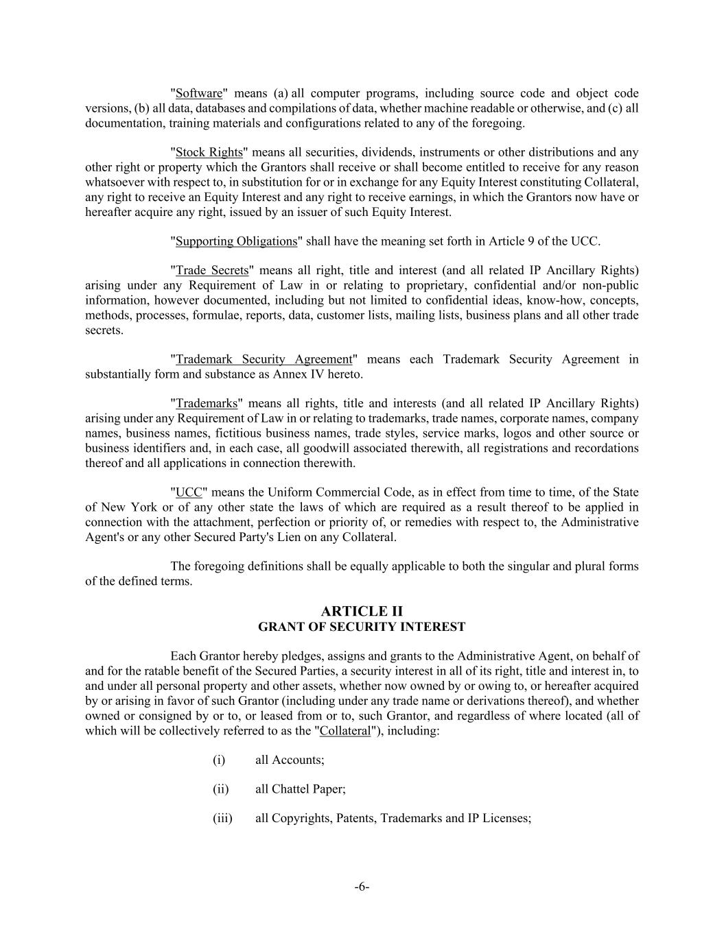 -6- "Software" means (a) all computer programs, including source code and object code versions, (b) all data, databases and compilations of data, whether machine readable or otherwise, and (c) all documentation, training materials and configurations related to any of the foregoing. "Stock Rights" means all securities, dividends, instruments or other distributions and any other right or property which the Grantors shall receive or shall become entitled to receive for any reason whatsoever with respect to, in substitution for or in exchange for any Equity Interest constituting Collateral, any right to receive an Equity Interest and any right to receive earnings, in which the Grantors now have or hereafter acquire any right, issued by an issuer of such Equity Interest. "Supporting Obligations" shall have the meaning set forth in Article 9 of the UCC. "Trade Secrets" means all right, title and interest (and all related IP Ancillary Rights) arising under any Requirement of Law in or relating to proprietary, confidential and/or non-public information, however documented, including but not limited to confidential ideas, know-how, concepts, methods, processes, formulae, reports, data, customer lists, mailing lists, business plans and all other trade secrets. "Trademark Security Agreement" means each Trademark Security Agreement in substantially form and substance as Annex IV hereto. "Trademarks" means all rights, title and interests (and all related IP Ancillary Rights) arising under any Requirement of Law in or relating to trademarks, trade names, corporate names, company names, business names, fictitious business names, trade styles, service marks, logos and other source or business identifiers and, in each case, all goodwill associated therewith, all registrations and recordations thereof and all applications in connection therewith. "UCC" means the Uniform Commercial Code, as in effect from time to time, of the State of New York or of any other state the laws of which are required as a result thereof to be applied in connection with the attachment, perfection or priority of, or remedies with respect to, the Administrative Agent's or any other Secured Party's Lien on any Collateral. The foregoing definitions shall be equally applicable to both the singular and plural forms of the defined terms. ARTICLE II GRANT OF SECURITY INTEREST Each Grantor hereby pledges, assigns and grants to the Administrative Agent, on behalf of and for the ratable benefit of the Secured Parties, a security interest in all of its right, title and interest in, to and under all personal property and other assets, whether now owned by or owing to, or hereafter acquired by or arising in favor of such Grantor (including under any trade name or derivations thereof), and whether owned or consigned by or to, or leased from or to, such Grantor, and regardless of where located (all of which will be collectively referred to as the "Collateral"), including: (i) all Accounts; (ii) all Chattel Paper; (iii) all Copyrights, Patents, Trademarks and IP Licenses;