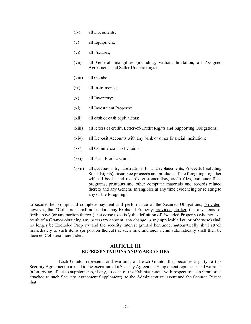 -7- (iv) all Documents; (v) all Equipment; (vi) all Fixtures; (vii) all General Intangibles (including, without limitation, all Assigned Agreements and Seller Undertakings); (viii) all Goods; (ix) all Instruments; (x) all Inventory; (xi) all Investment Property; (xii) all cash or cash equivalents; (xiii) all letters of credit, Letter-of-Credit Rights and Supporting Obligations; (xiv) all Deposit Accounts with any bank or other financial institution; (xv) all Commercial Tort Claims; (xvi) all Farm Products; and (xvii) all accessions to, substitutions for and replacements, Proceeds (including Stock Rights), insurance proceeds and products of the foregoing, together with all books and records, customer lists, credit files, computer files, programs, printouts and other computer materials and records related thereto and any General Intangibles at any time evidencing or relating to any of the foregoing; to secure the prompt and complete payment and performance of the Secured Obligations; provided, however, that "Collateral" shall not include any Excluded Property; provided, further, that any items set forth above (or any portion thereof) that cease to satisfy the definition of Excluded Property (whether as a result of a Grantor obtaining any necessary consent, any change in any applicable law or otherwise) shall no longer be Excluded Property and the security interest granted hereunder automatically shall attach immediately to such items (or portion thereof) at such time and such items automatically shall then be deemed Collateral hereunder. ARTICLE III REPRESENTATIONS AND WARRANTIES Each Grantor represents and warrants, and each Grantor that becomes a party to this Security Agreement pursuant to the execution of a Security Agreement Supplement represents and warrants (after giving effect to supplements, if any, to each of the Exhibits hereto with respect to such Grantor as attached to such Security Agreement Supplement), to the Administrative Agent and the Secured Parties that: