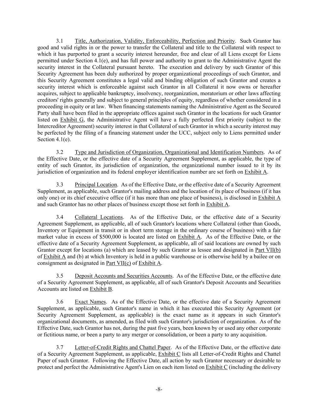 -8- 3.1 Title, Authorization, Validity, Enforceability, Perfection and Priority. Such Grantor has good and valid rights in or the power to transfer the Collateral and title to the Collateral with respect to which it has purported to grant a security interest hereunder, free and clear of all Liens except for Liens permitted under Section 4.1(e), and has full power and authority to grant to the Administrative Agent the security interest in the Collateral pursuant hereto. The execution and delivery by such Grantor of this Security Agreement has been duly authorized by proper organizational proceedings of such Grantor, and this Security Agreement constitutes a legal valid and binding obligation of such Grantor and creates a security interest which is enforceable against such Grantor in all Collateral it now owns or hereafter acquires, subject to applicable bankruptcy, insolvency, reorganization, moratorium or other laws affecting creditors' rights generally and subject to general principles of equity, regardless of whether considered in a proceeding in equity or at law. When financing statements naming the Administrative Agent as the Secured Party shall have been filed in the appropriate offices against such Grantor in the locations for such Grantor listed on Exhibit G, the Administrative Agent will have a fully perfected first priority (subject to the Intercreditor Agreement) security interest in that Collateral of such Grantor in which a security interest may be perfected by the filing of a financing statement under the UCC, subject only to Liens permitted under Section 4.1(e). 3.2 Type and Jurisdiction of Organization, Organizational and Identification Numbers. As of the Effective Date, or the effective date of a Security Agreement Supplement, as applicable, the type of entity of such Grantor, its jurisdiction of organization, the organizational number issued to it by its jurisdiction of organization and its federal employer identification number are set forth on Exhibit A. 3.3 Principal Location. As of the Effective Date, or the effective date of a Security Agreement Supplement, as applicable, such Grantor's mailing address and the location of its place of business (if it has only one) or its chief executive office (if it has more than one place of business), is disclosed in Exhibit A and such Grantor has no other places of business except those set forth in Exhibit A. 3.4 Collateral Locations. As of the Effective Date, or the effective date of a Security Agreement Supplement, as applicable, all of such Grantor's locations where Collateral (other than Goods, Inventory or Equipment in transit or in short term storage in the ordinary course of business) with a fair market value in excess of $500,000 is located are listed on Exhibit A. As of the Effective Date, or the effective date of a Security Agreement Supplement, as applicable, all of said locations are owned by such Grantor except for locations (a) which are leased by such Grantor as lessee and designated in Part VII(b) of Exhibit A and (b) at which Inventory is held in a public warehouse or is otherwise held by a bailee or on consignment as designated in Part VII(c) of Exhibit A. 3.5 Deposit Accounts and Securities Accounts. As of the Effective Date, or the effective date of a Security Agreement Supplement, as applicable, all of such Grantor's Deposit Accounts and Securities Accounts are listed on Exhibit B. 3.6 Exact Names. As of the Effective Date, or the effective date of a Security Agreement Supplement, as applicable, such Grantor's name in which it has executed this Security Agreement (or Security Agreement Supplement, as applicable) is the exact name as it appears in such Grantor's organizational documents, as amended, as filed with such Grantor's jurisdiction of organization. As of the Effective Date, such Grantor has not, during the past five years, been known by or used any other corporate or fictitious name, or been a party to any merger or consolidation, or been a party to any acquisition. 3.7 Letter-of-Credit Rights and Chattel Paper. As of the Effective Date, or the effective date of a Security Agreement Supplement, as applicable, Exhibit C lists all Letter-of-Credit Rights and Chattel Paper of such Grantor. Following the Effective Date, all action by such Grantor necessary or desirable to protect and perfect the Administrative Agent's Lien on each item listed on Exhibit C (including the delivery